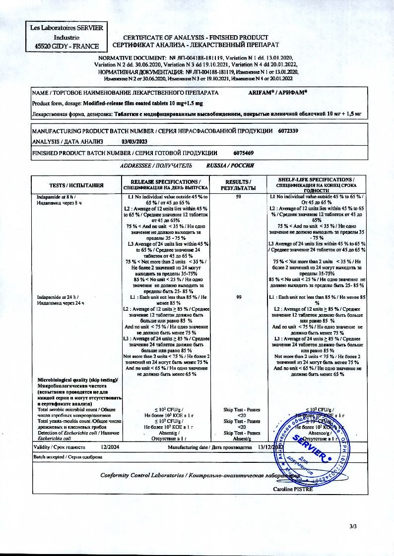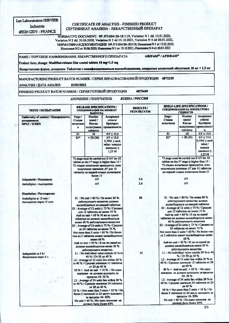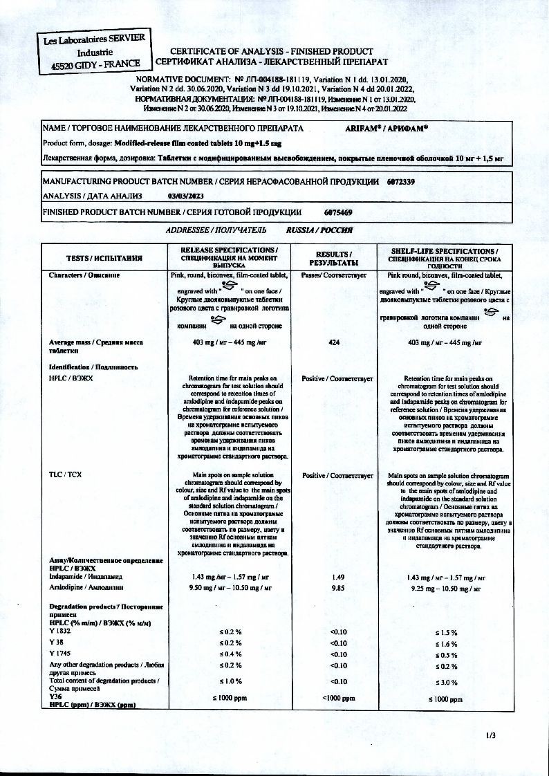 Арифам 5 мг + 1,5 мг 30 шт таблетки покрытые пленочной оболочкой с модифицированным высвобождением