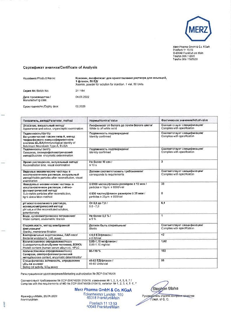 Ксеомин 50 ЕД 1 шт лиофилизат для приготовления раствора для внутримышечного введения флакон