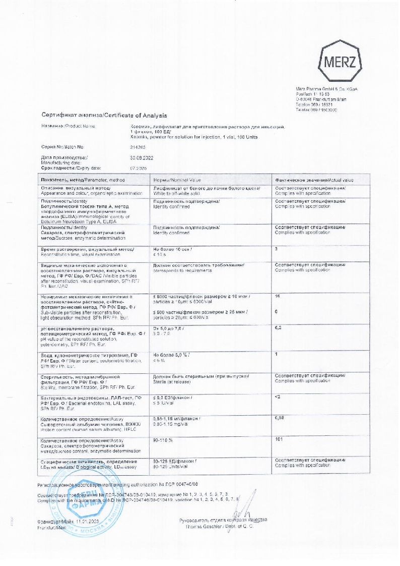 Ксеомин 100 ЕД 1 шт лиофилизат для приготовления раствора для внутримышечного введения флакон