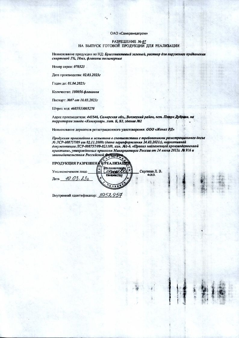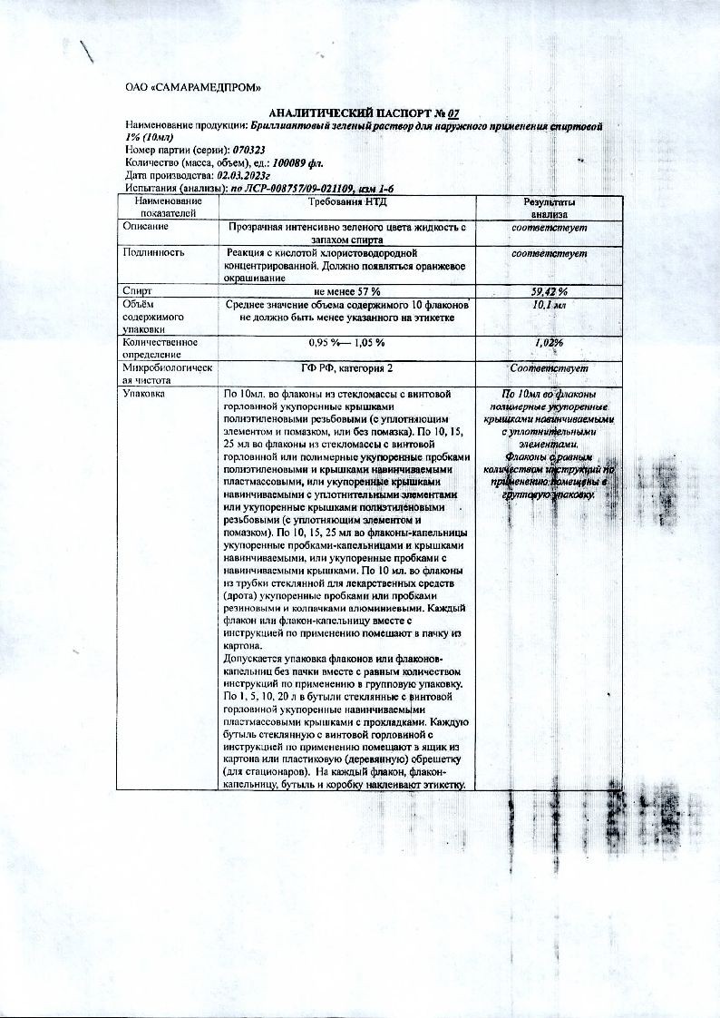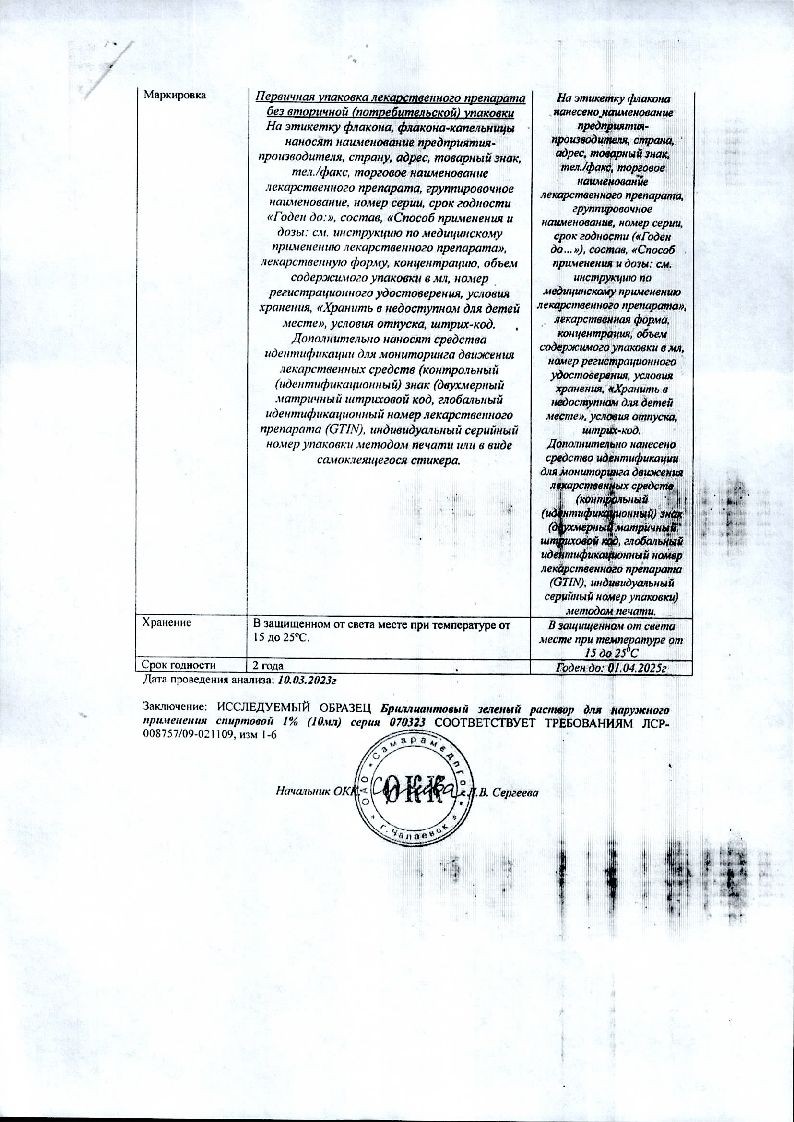 Бриллиантовый зеленый 1 % 10 мл раствор для наружного применения спиртовой