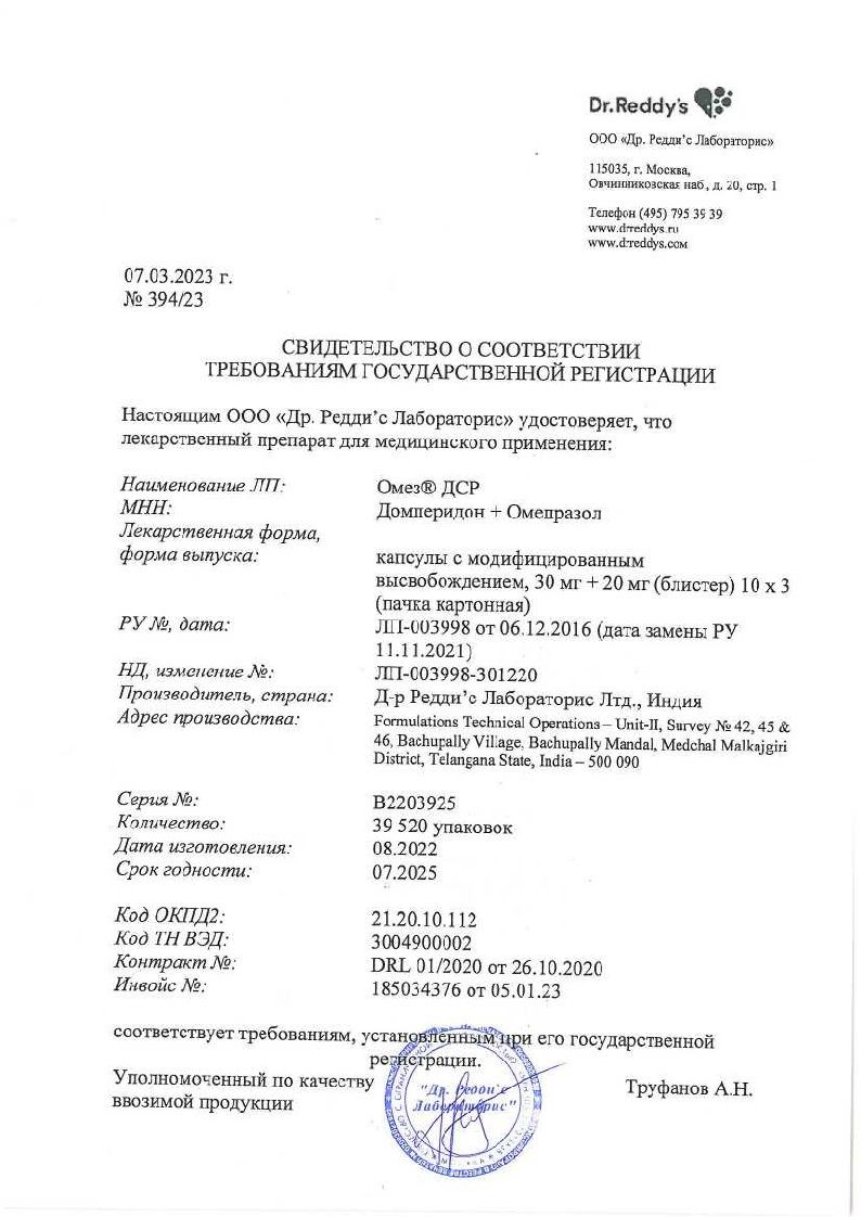 Омез ДСР 30 мг + 20 мг 30 шт капсулы с модифицированным высвобождением