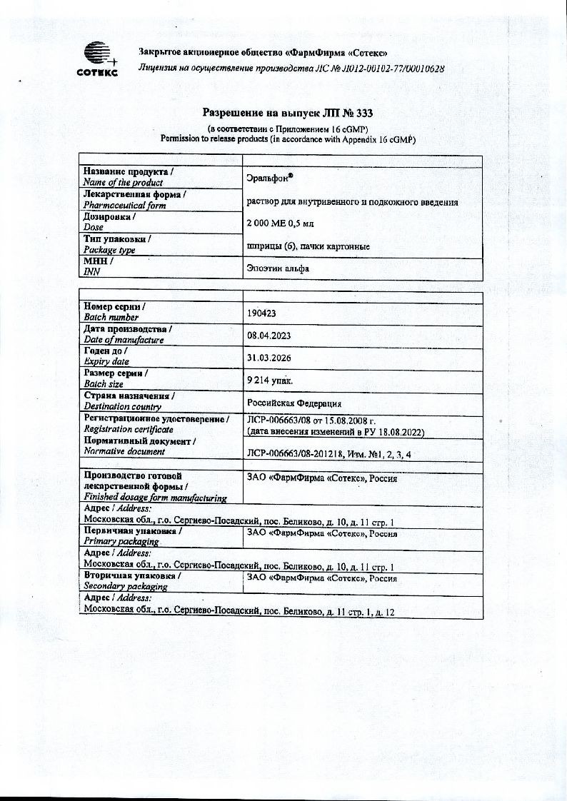 Эральфон 4000 МЕ 0,4 мл 6 шт раствор для внутривенного и подкожного введения шприц с устройством защиты иглы
