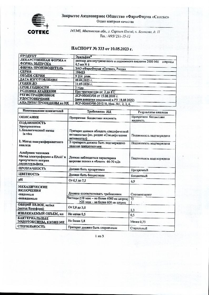 Эральфон 2000 МЕ 0,5 мл 6 шт раствор для внутривенного и подкожного введения шприцы