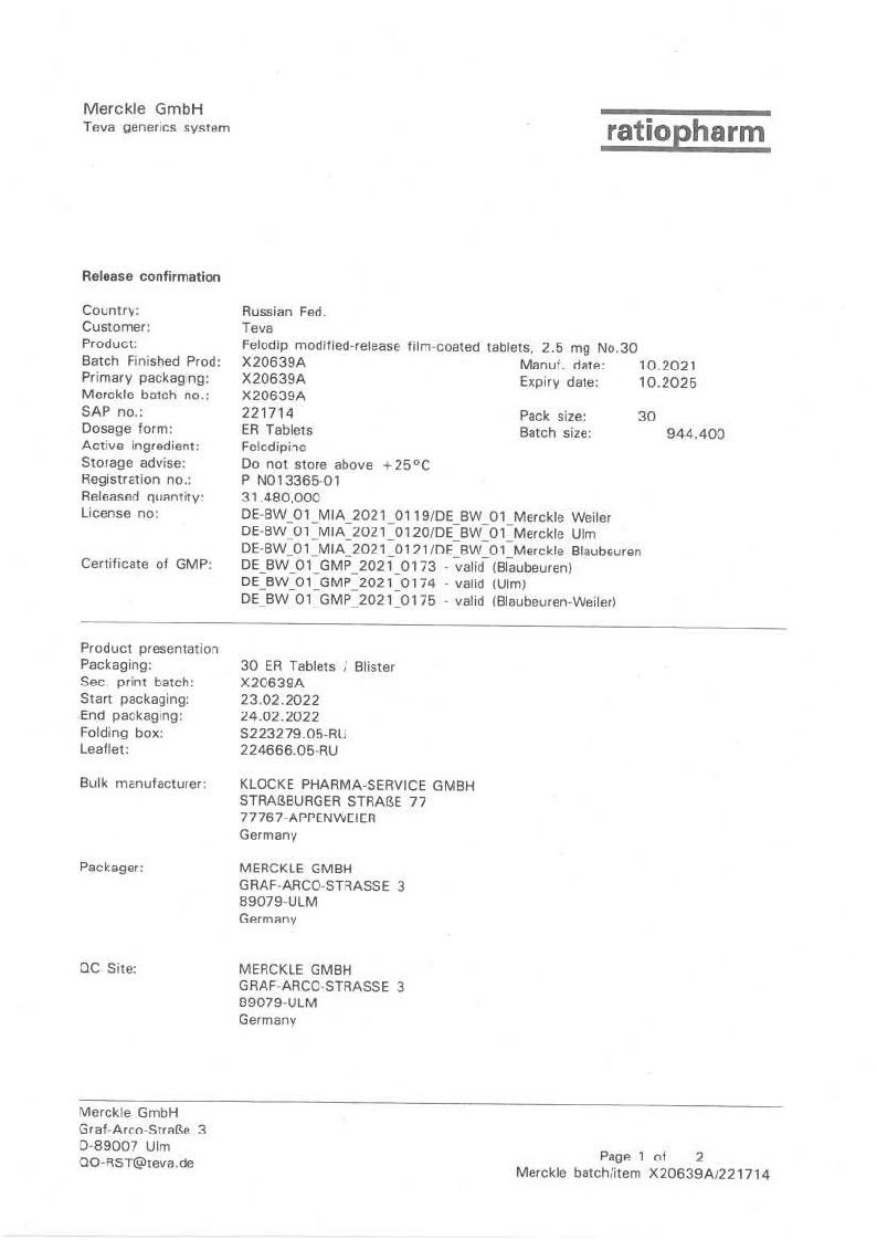 Фелодип 2,5 мг 30 шт таблетки с пролонгированным высвобождением покрытые пленочной оболочкой