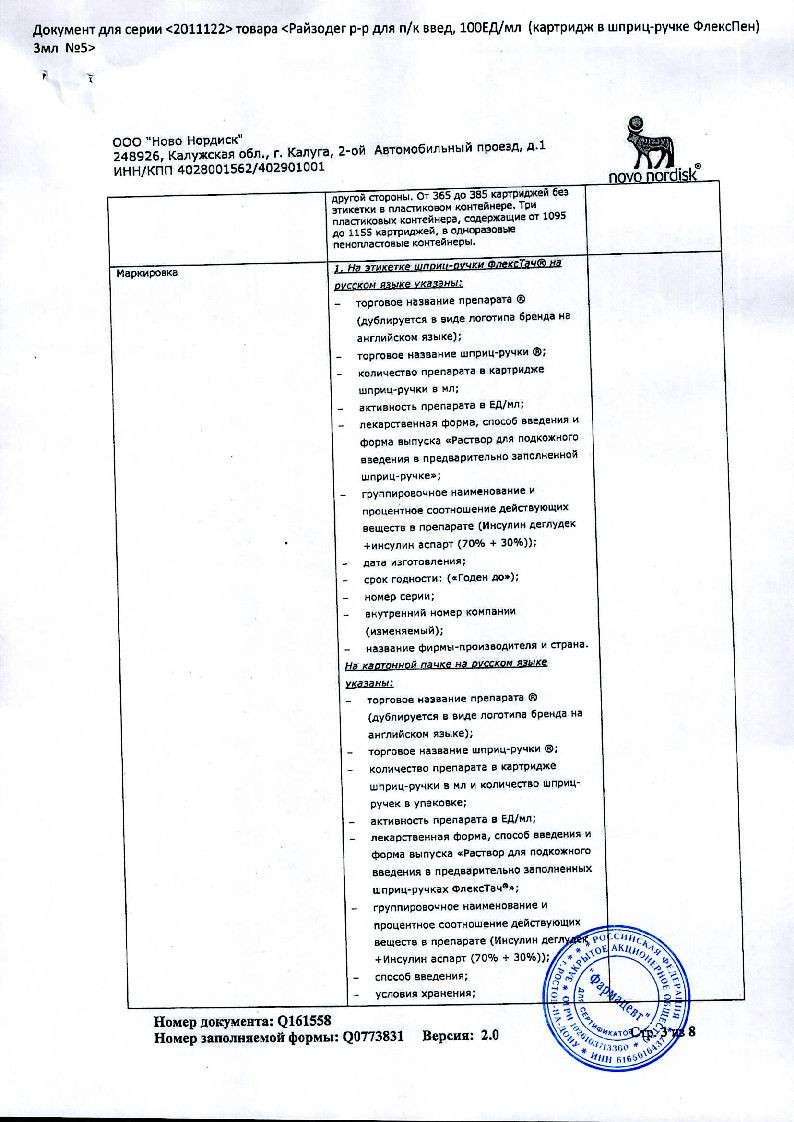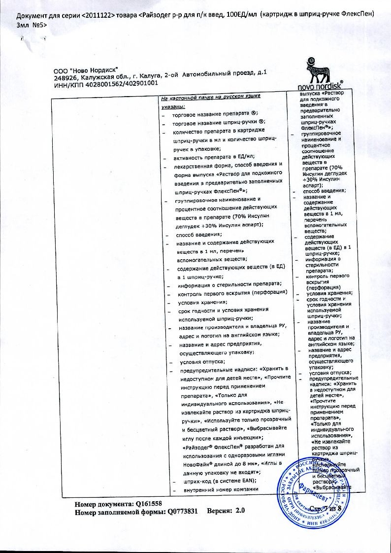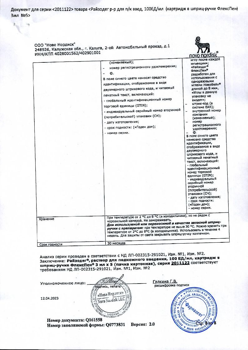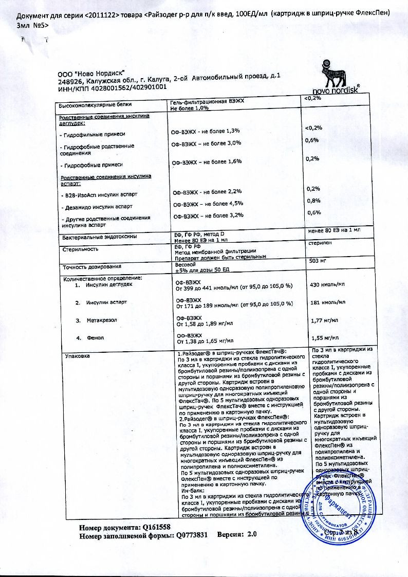 В корзинуРайзодег ФлексПен 100 ЕД/мл 3 мл 5 шт раствор для подкожного введения шприц-ручка