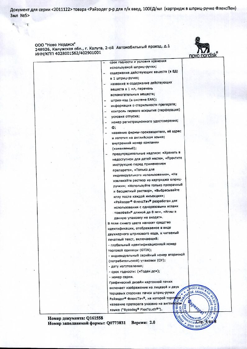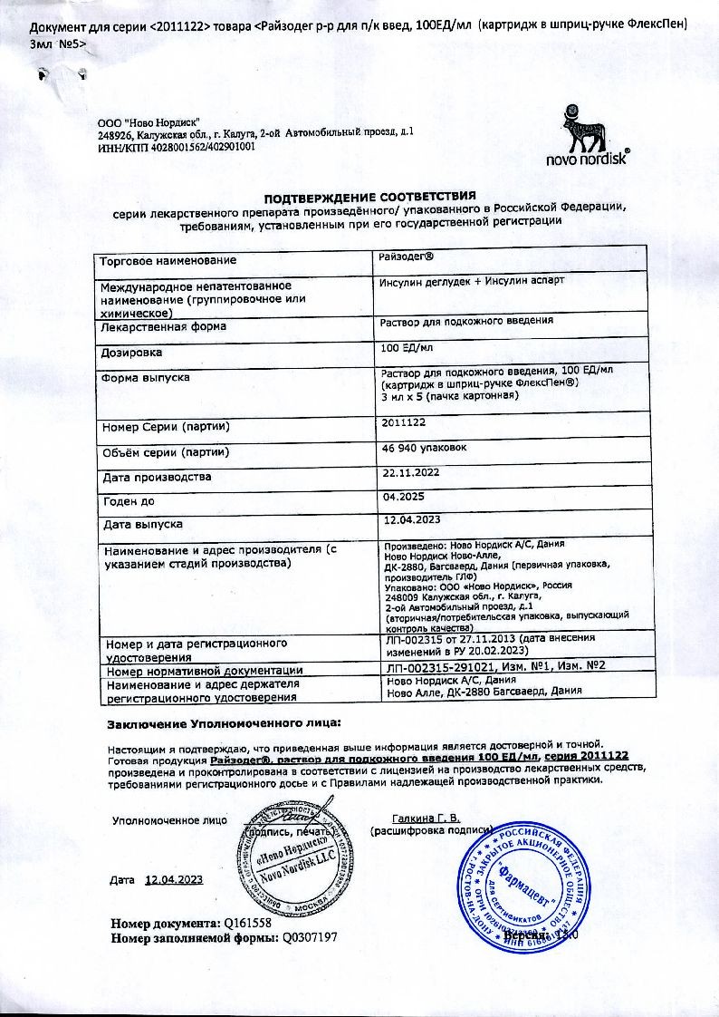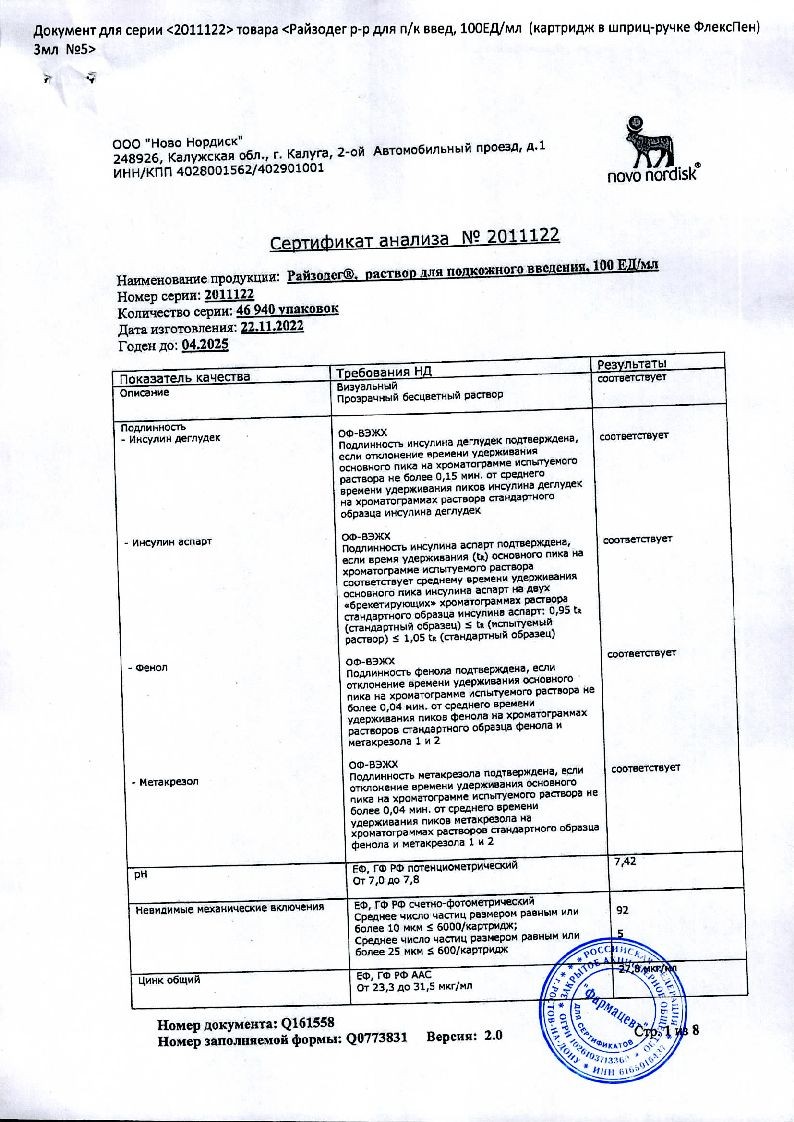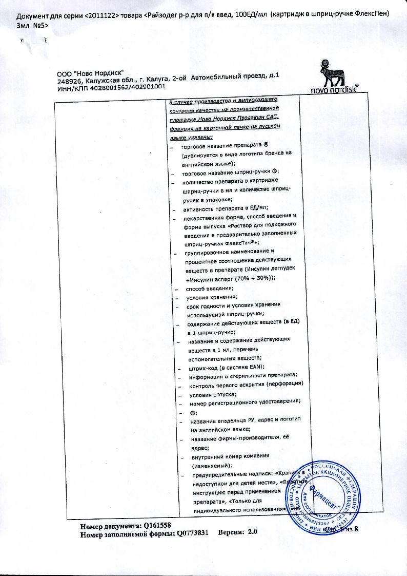 В корзинуРайзодег ФлексПен 100 ЕД/мл 3 мл 5 шт раствор для подкожного введения шприц-ручка