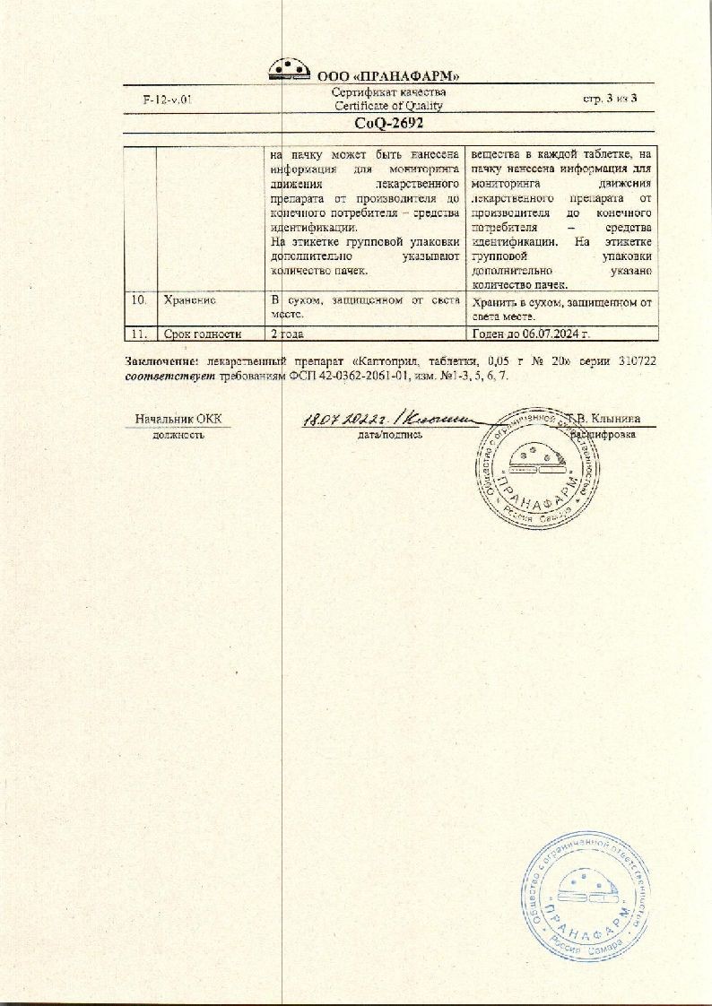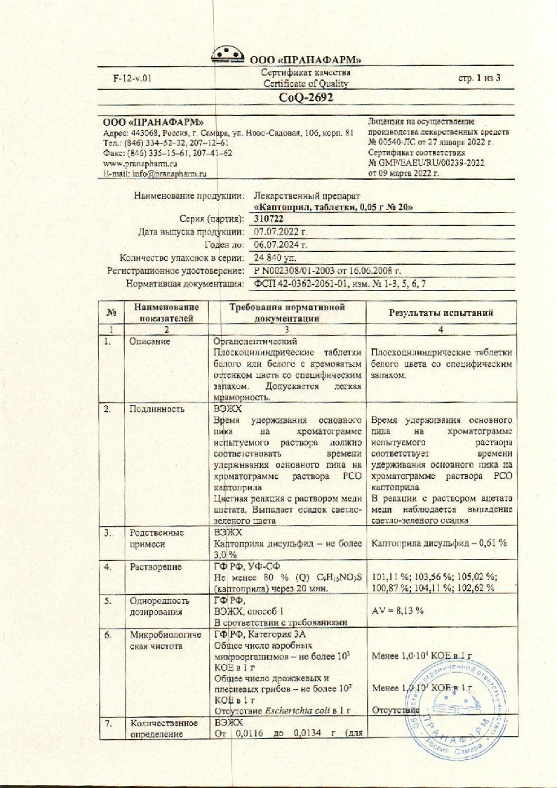 Каптоприл 50 мг 20 шт таблетки