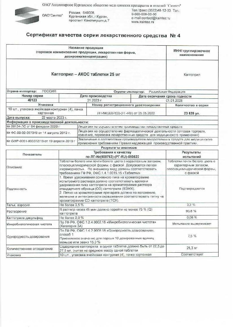 Купить: Каптоприл-Акос 25 мг 40 шт таблетки