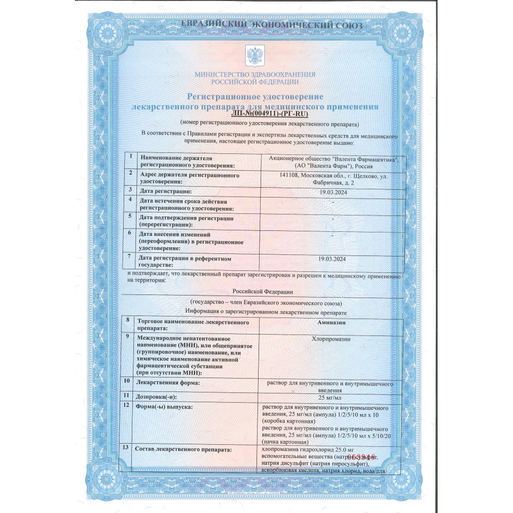 Аминазин 25 мг/мл 2 мл 10 шт раствор для внутривенного и внутримышечного введения