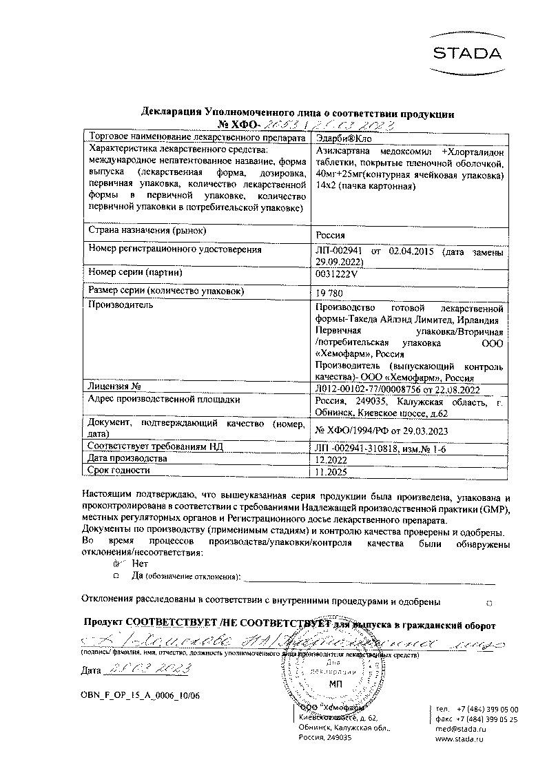 Эдарби Кло 40 мг + 12,5 мг 28 шт таблетки покрытые пленочной оболочкой