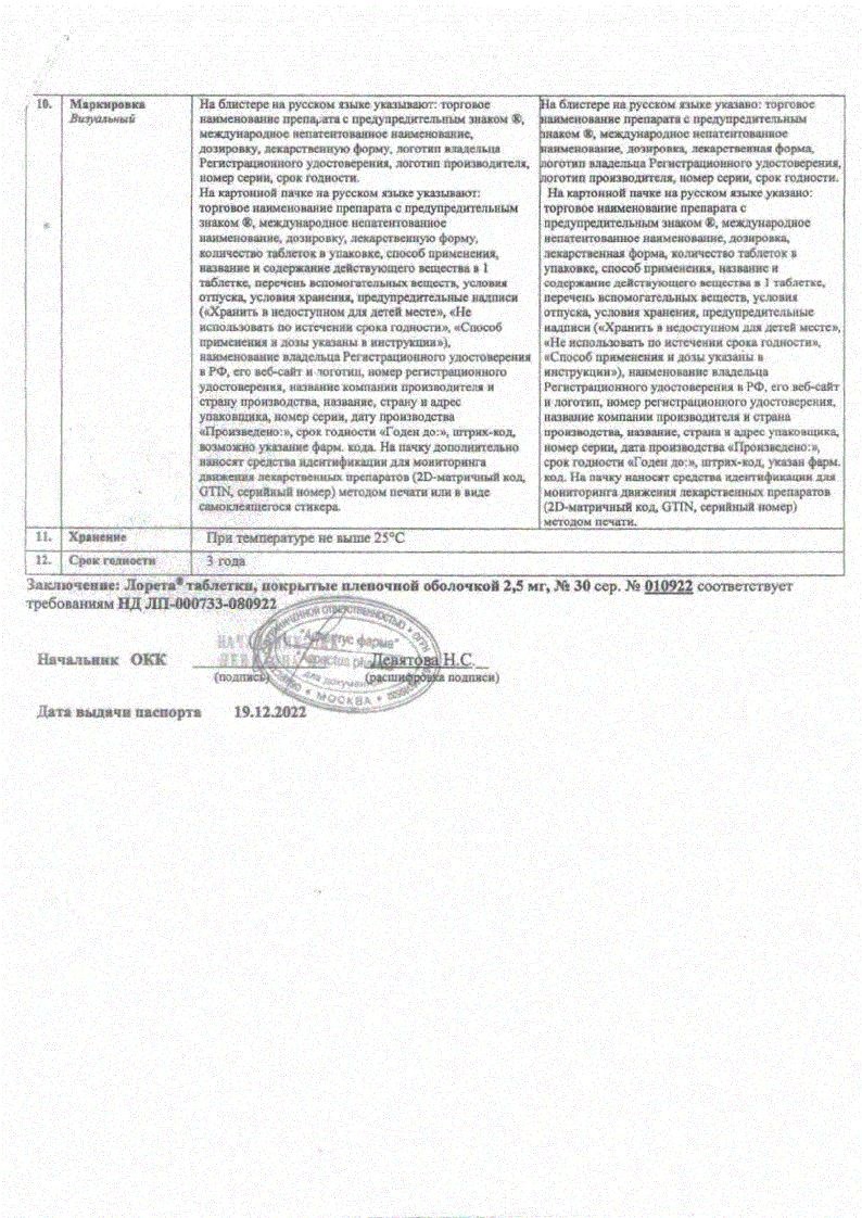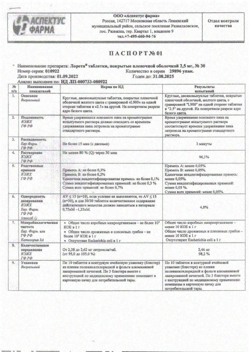 Лорета 2,5 мг 30 шт таблетки покрытые пленочной оболочкой