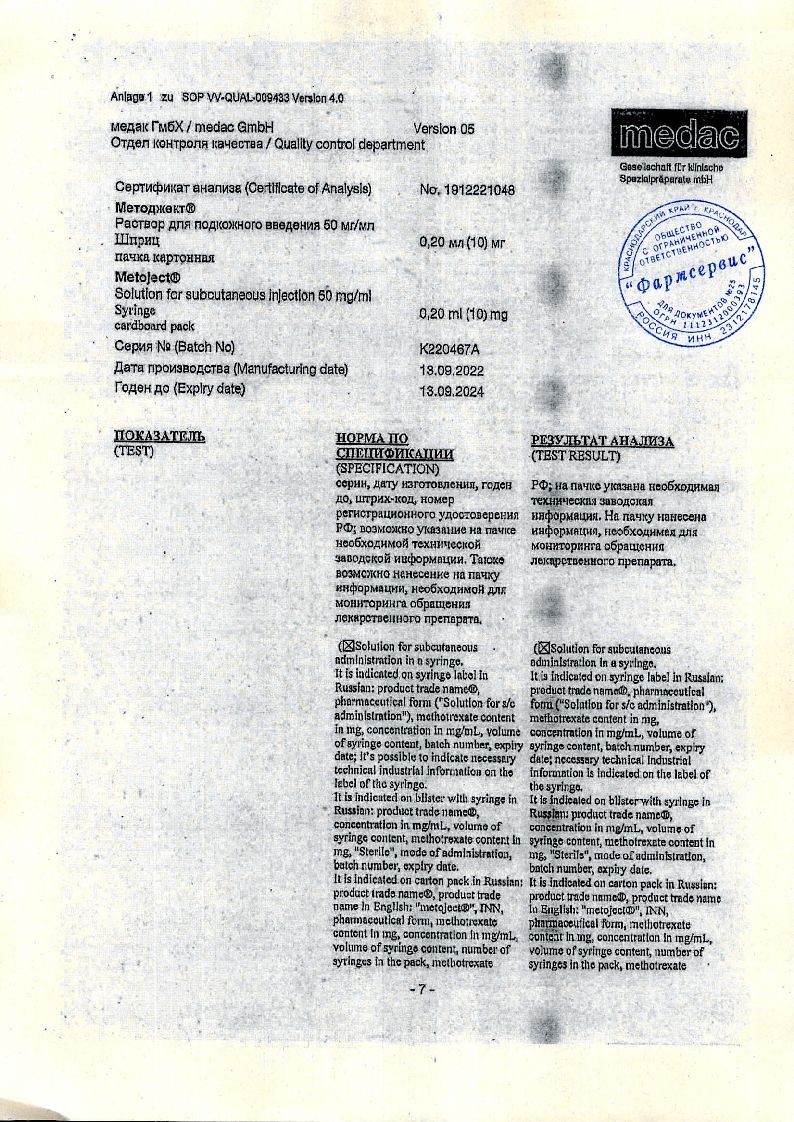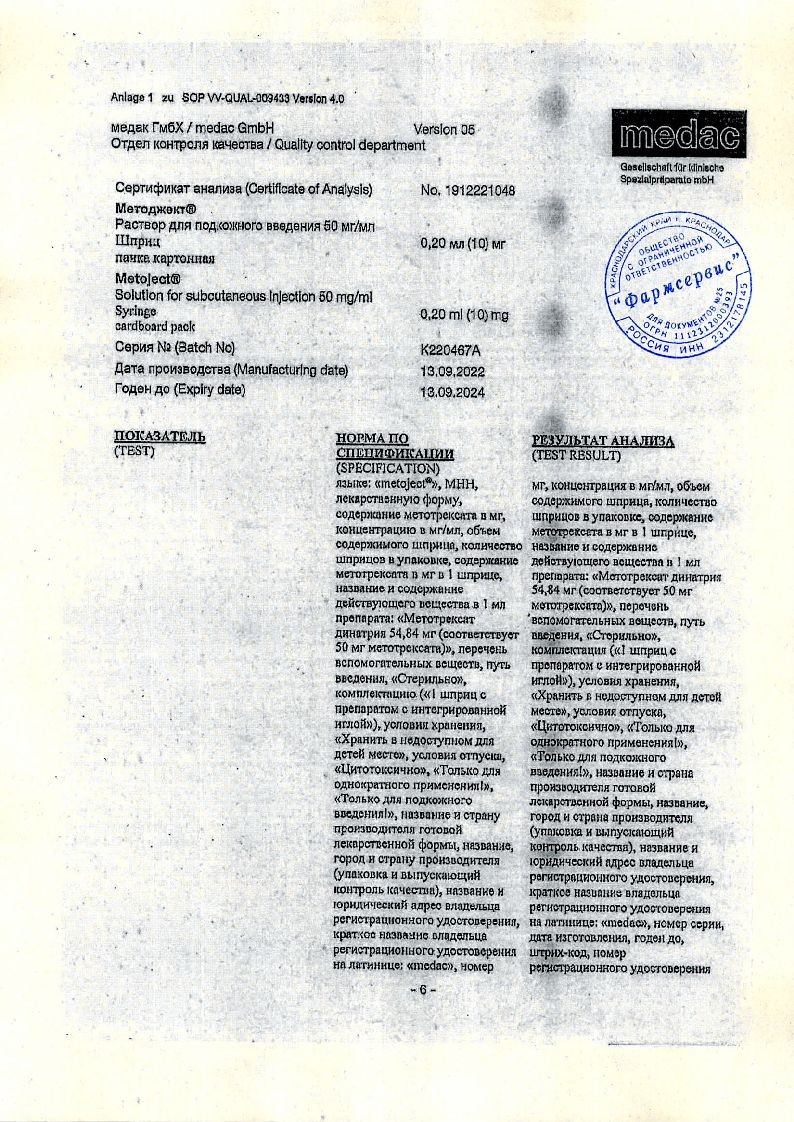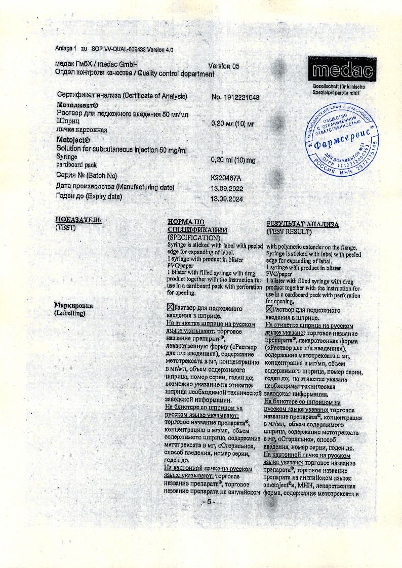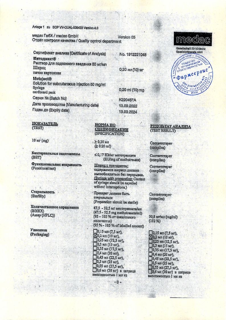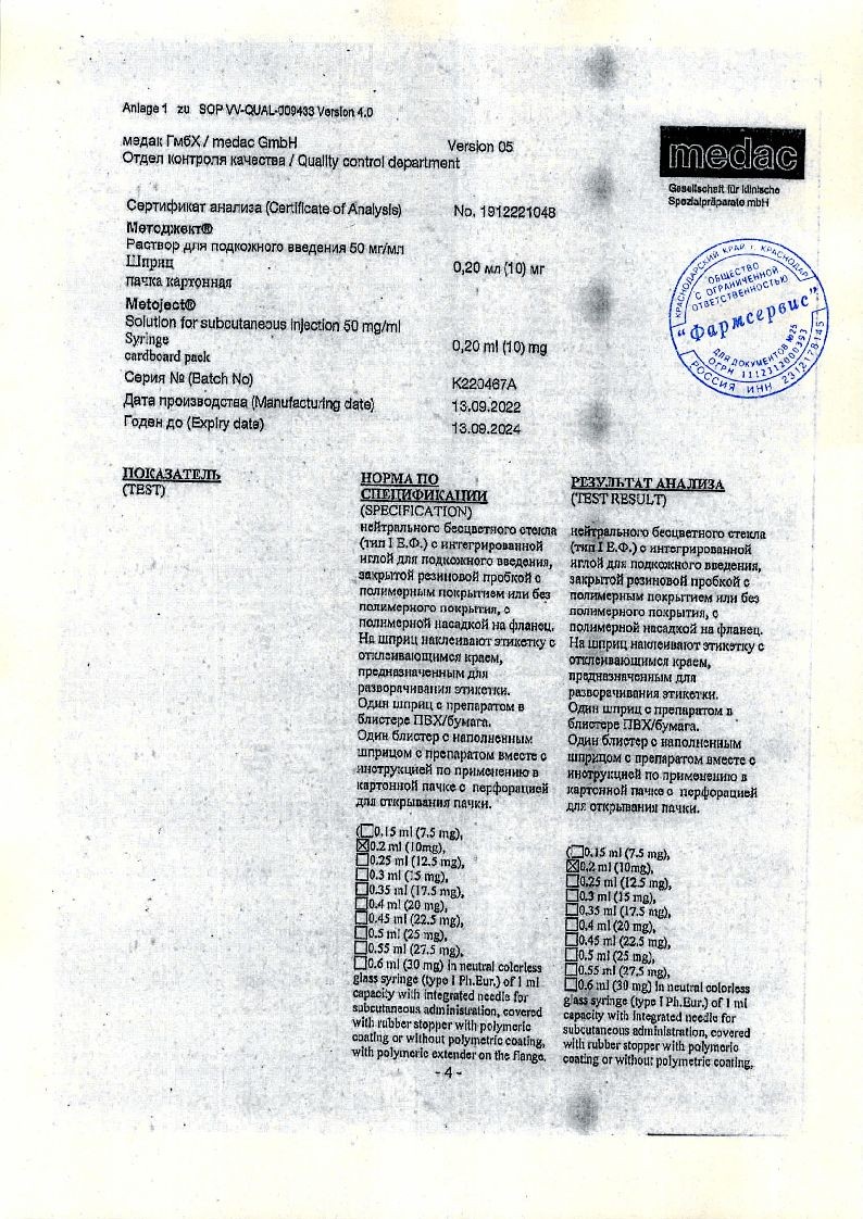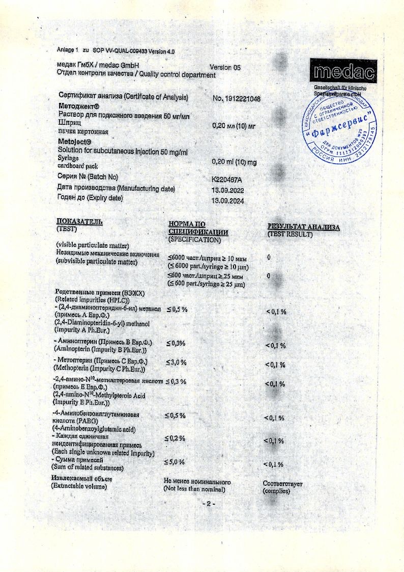 Методжект 50 мг/мл 0,2 мл 1 шт раствор для инъекций шприц в комплекте с иглой