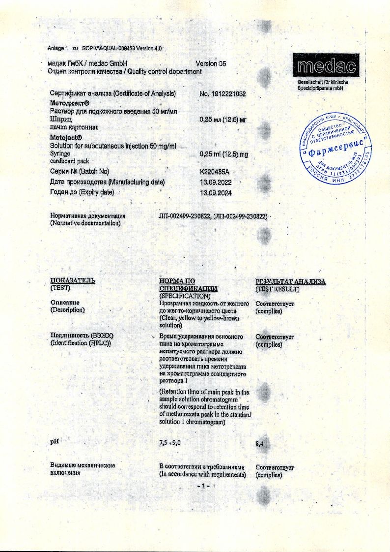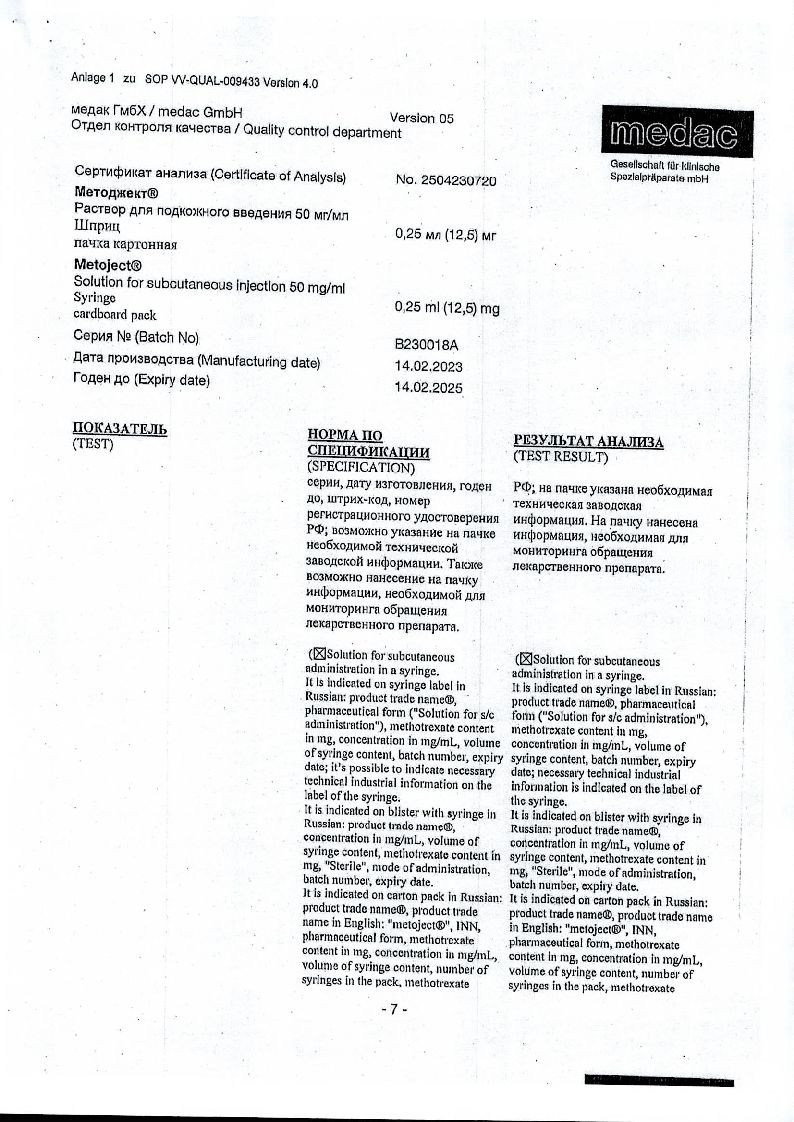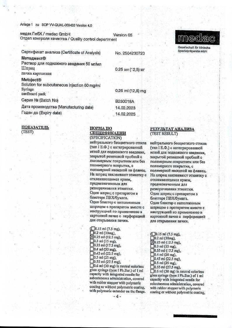 Методжект 50 мг/мл 0,25 мл 1 шт раствор для инъекций шприц в комплекте с иглой