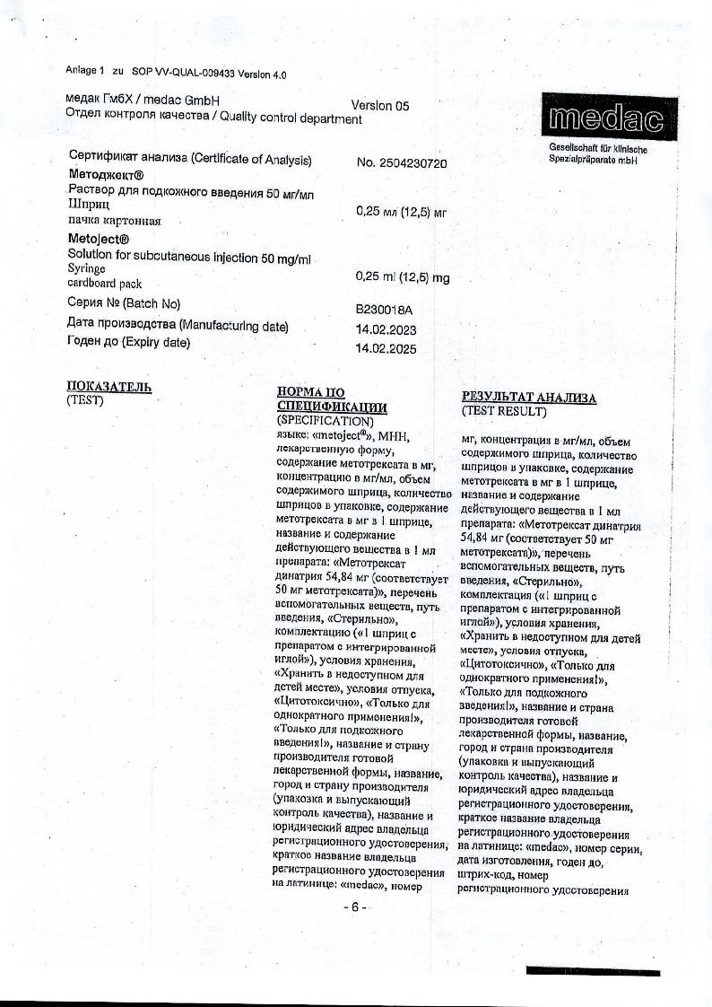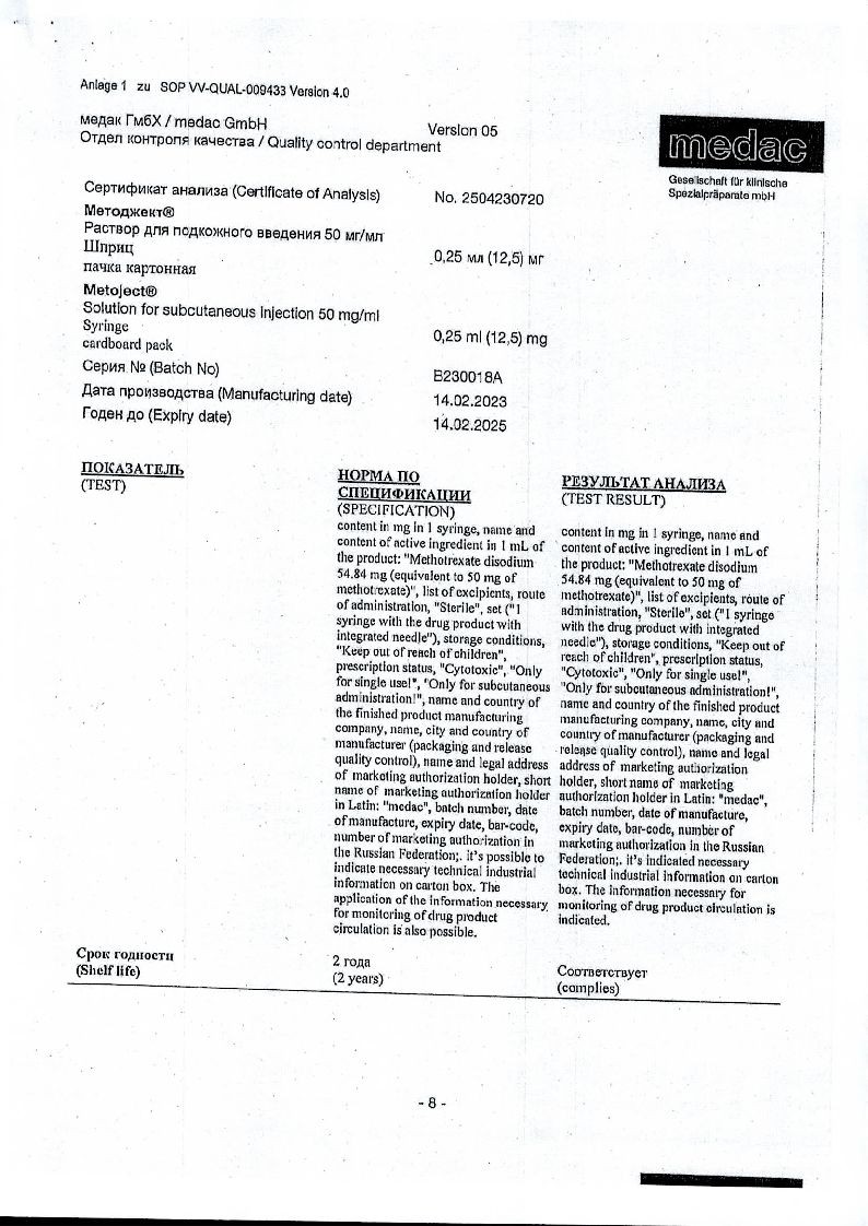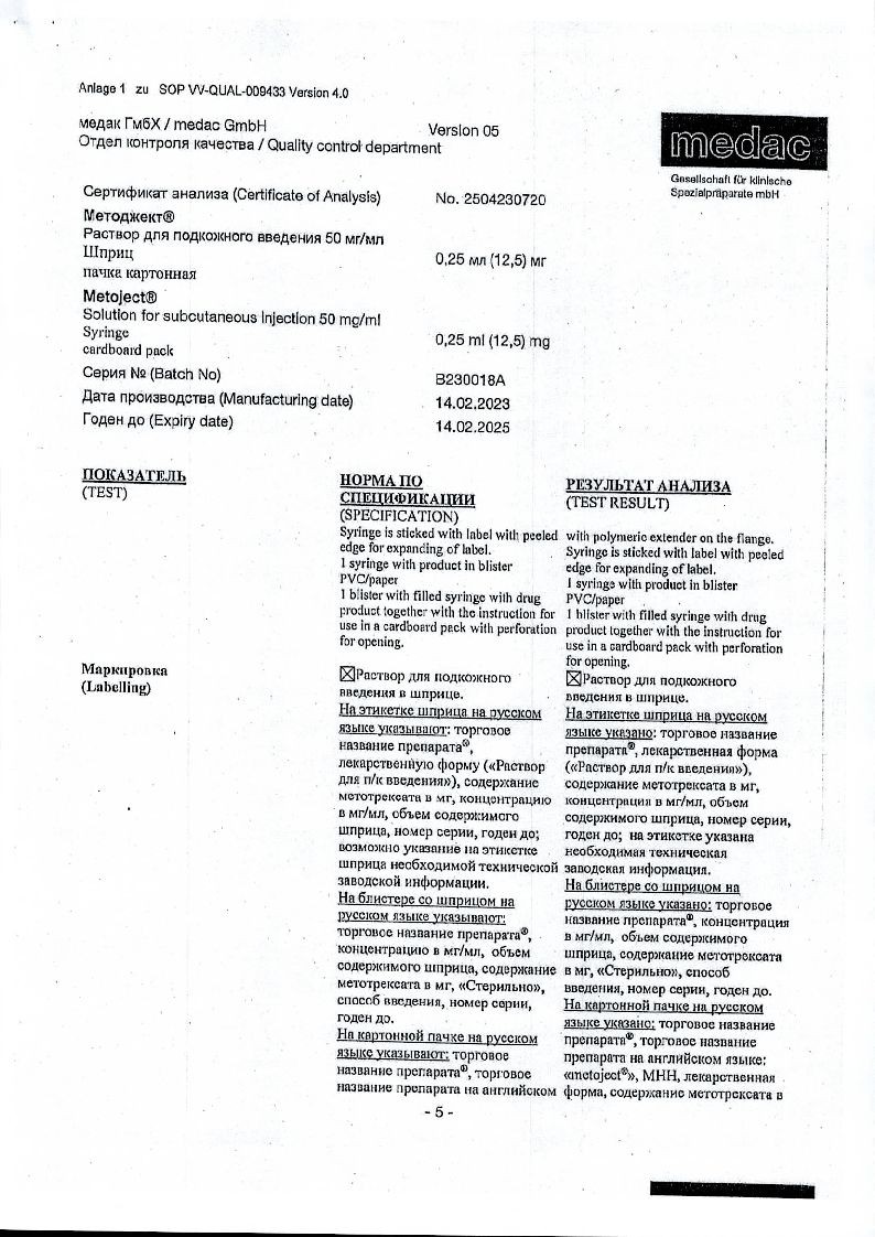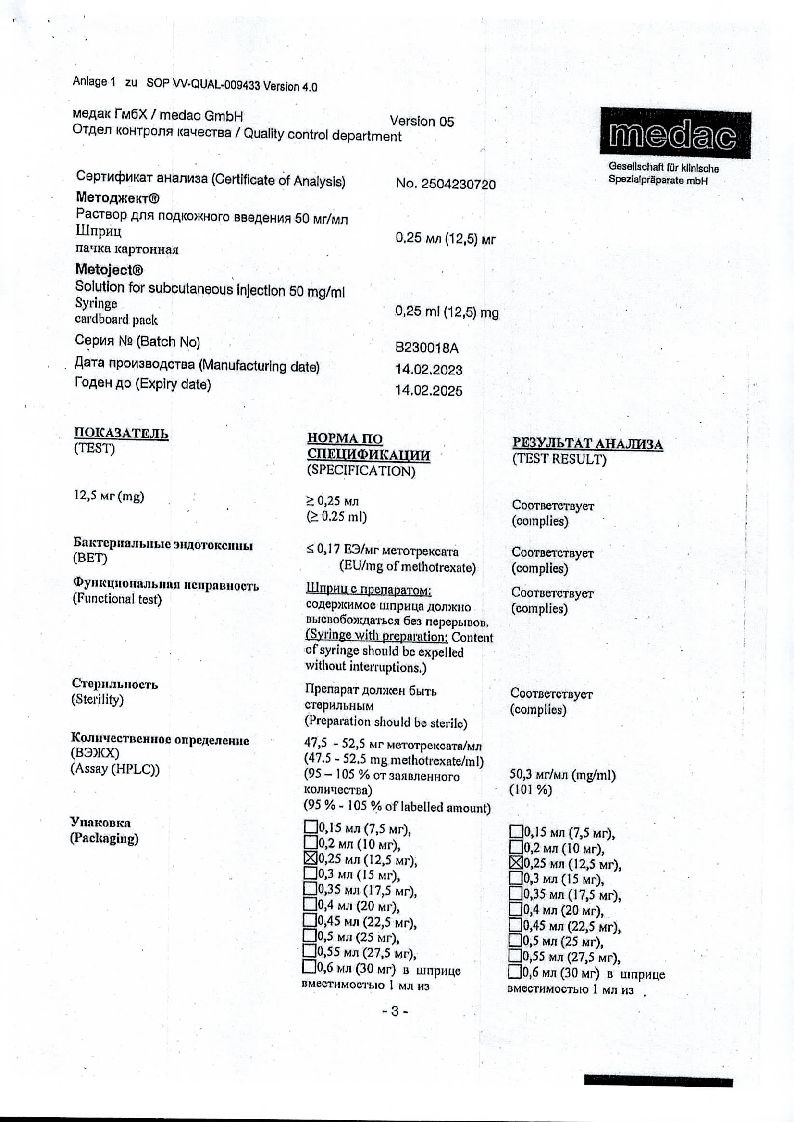 Методжект 50 мг/мл 0,25 мл 1 шт раствор для инъекций шприц в комплекте с иглой
