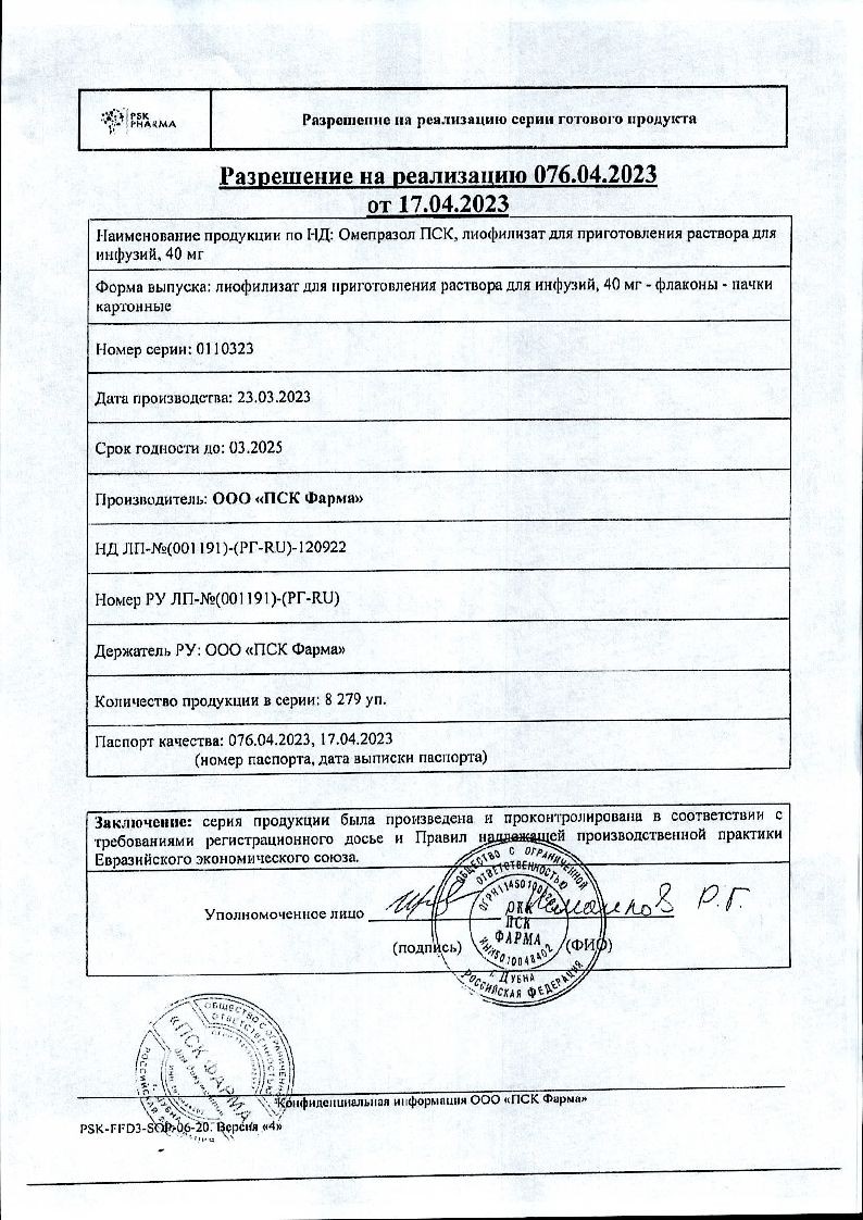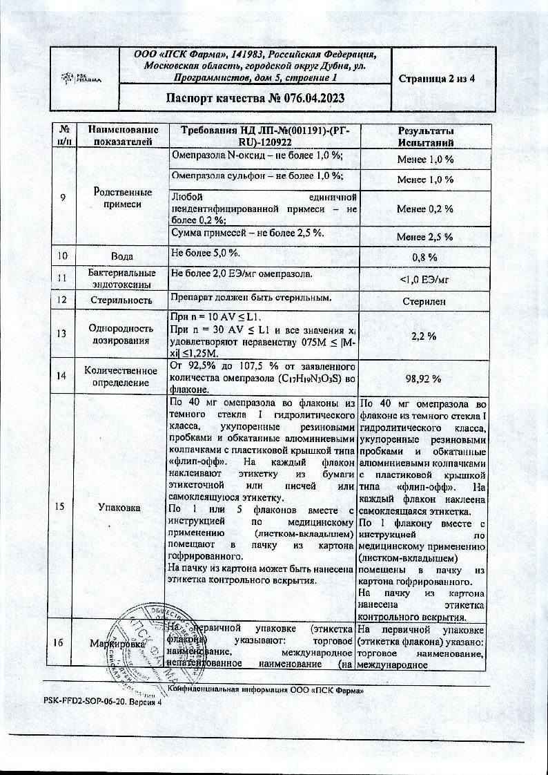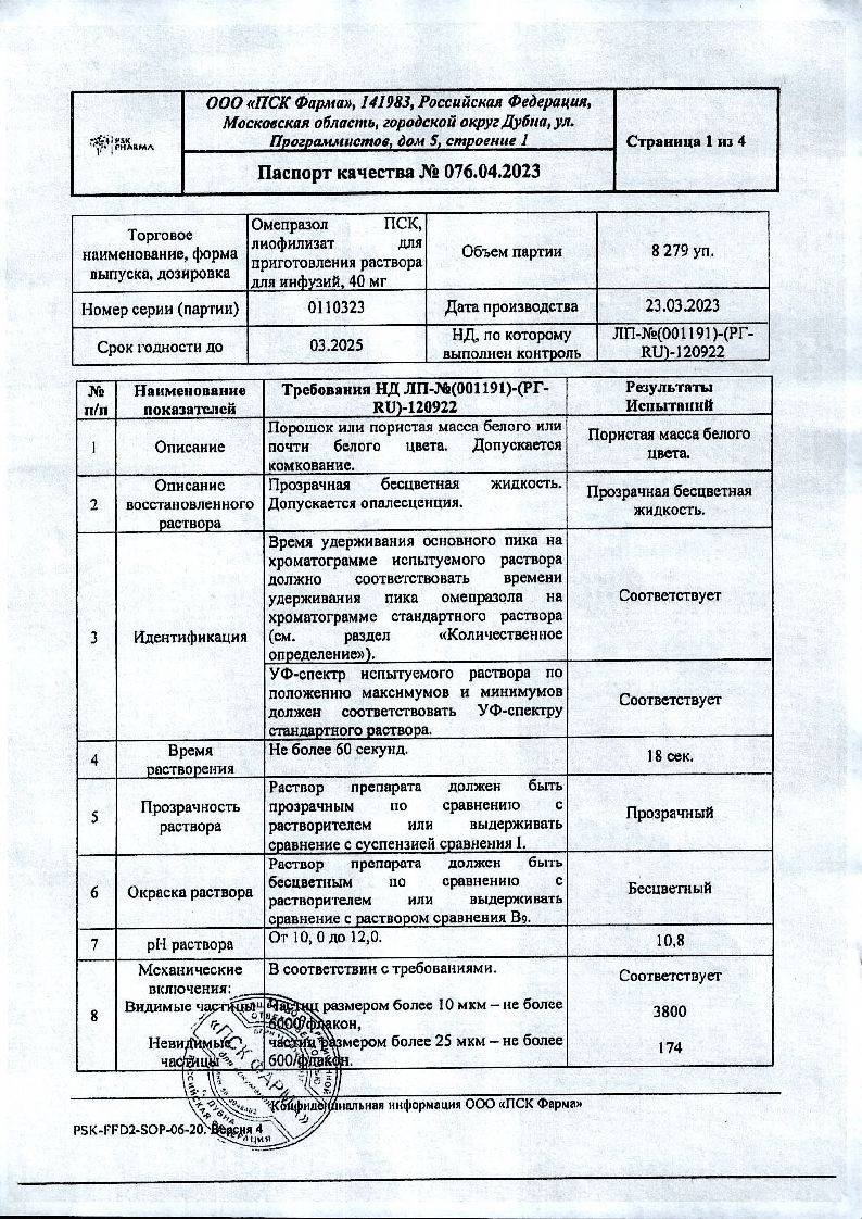 Омепразол-ПСК 40 мг 1 шт лиофилизат для приготовления раствора для инфузий флакон