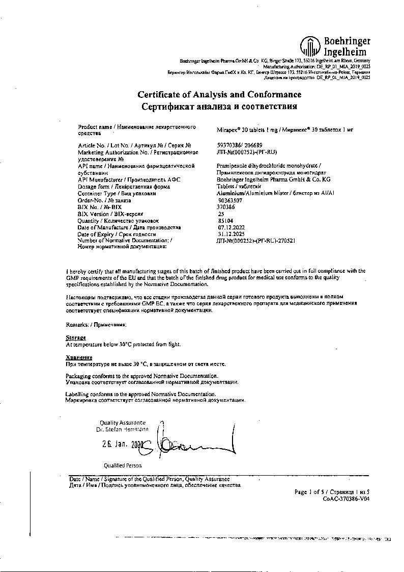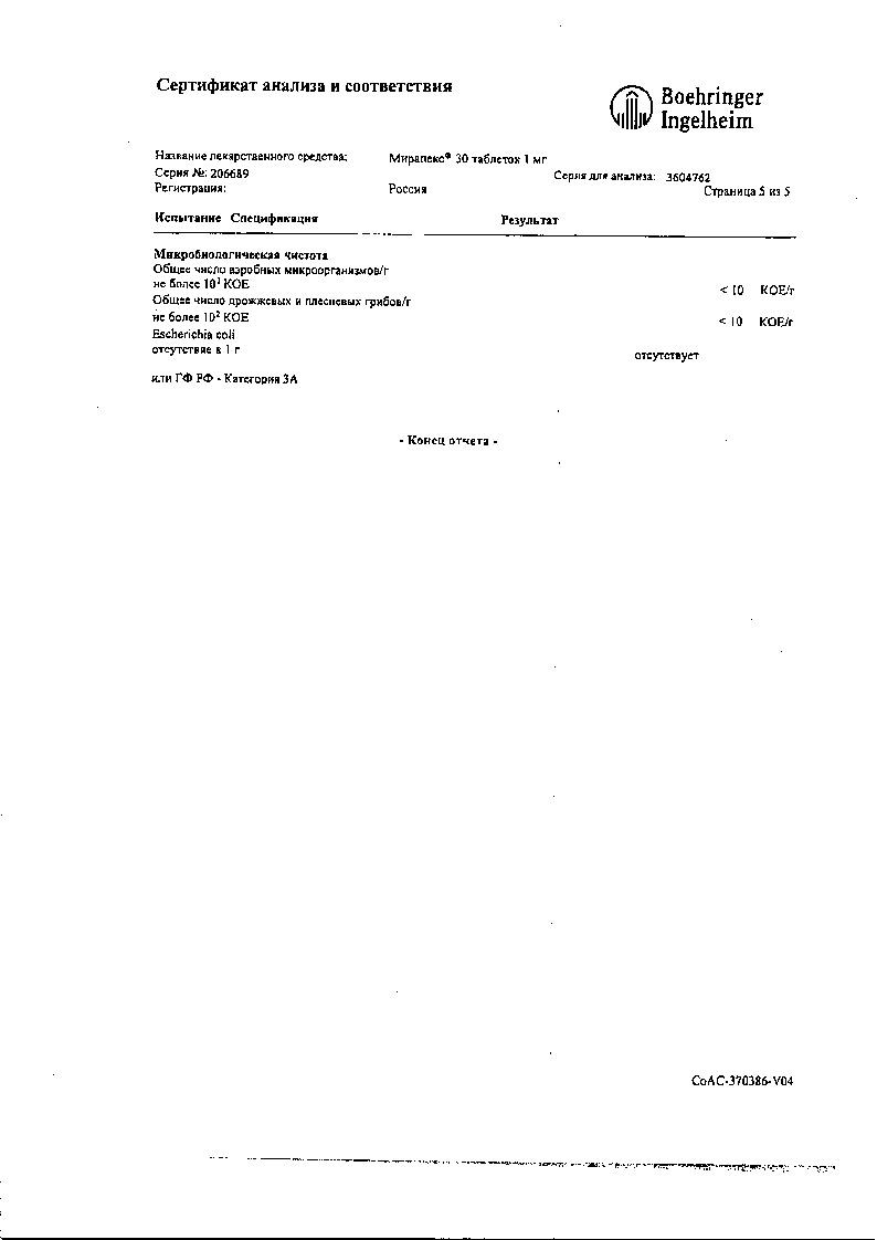 Мирапекс ПД 1,5 мг 30 шт таблетки с пролонгированным высвобождением