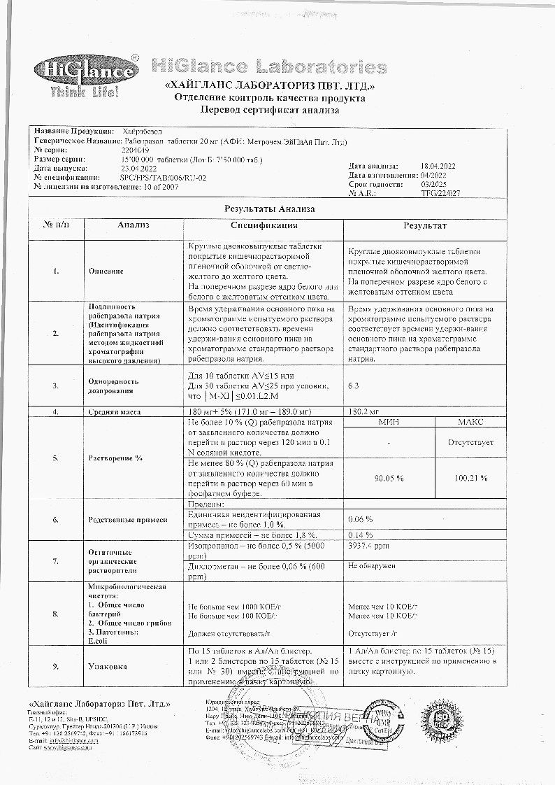 Хайрабезол 20 мг 30 шт таблетки покрытые кишечнорастворимой пленочной оболочкой