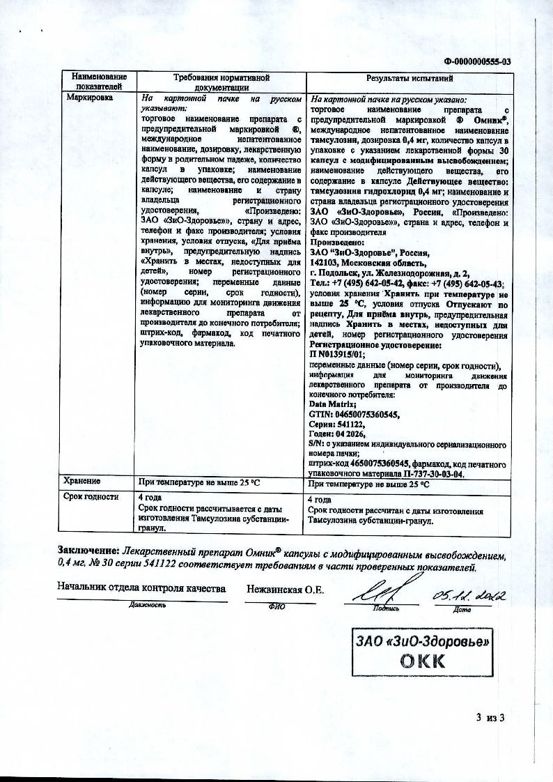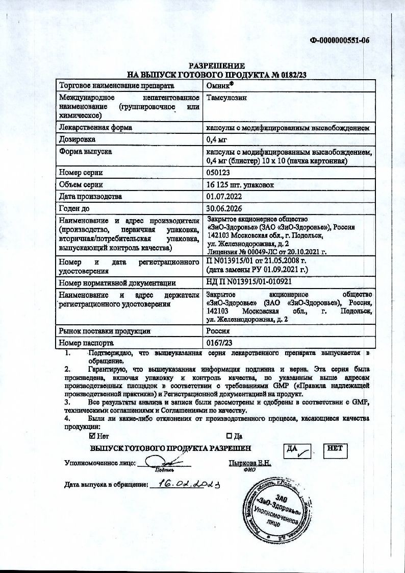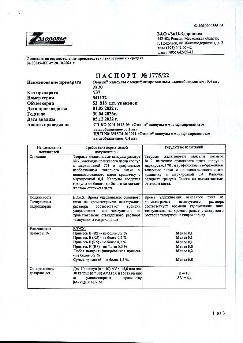Омник 0,4 мг 30 шт капсулы с модифицированным высвобождением