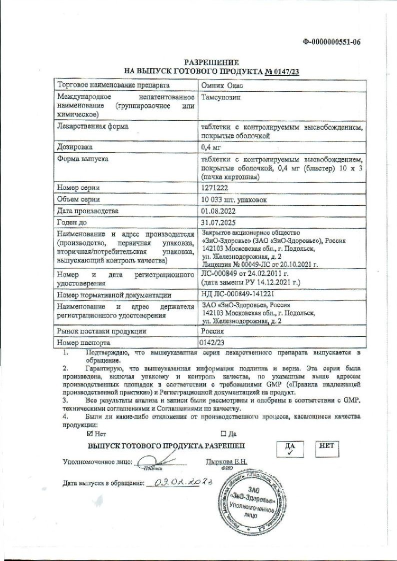 Омник Окас 0,4 мг 100 шт таблетки с контролируемым высвобождением покрытые оболочкой
