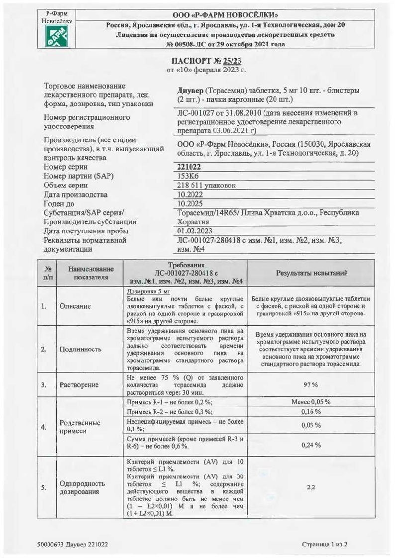 Диувер 5 мг 60 шт таблетки