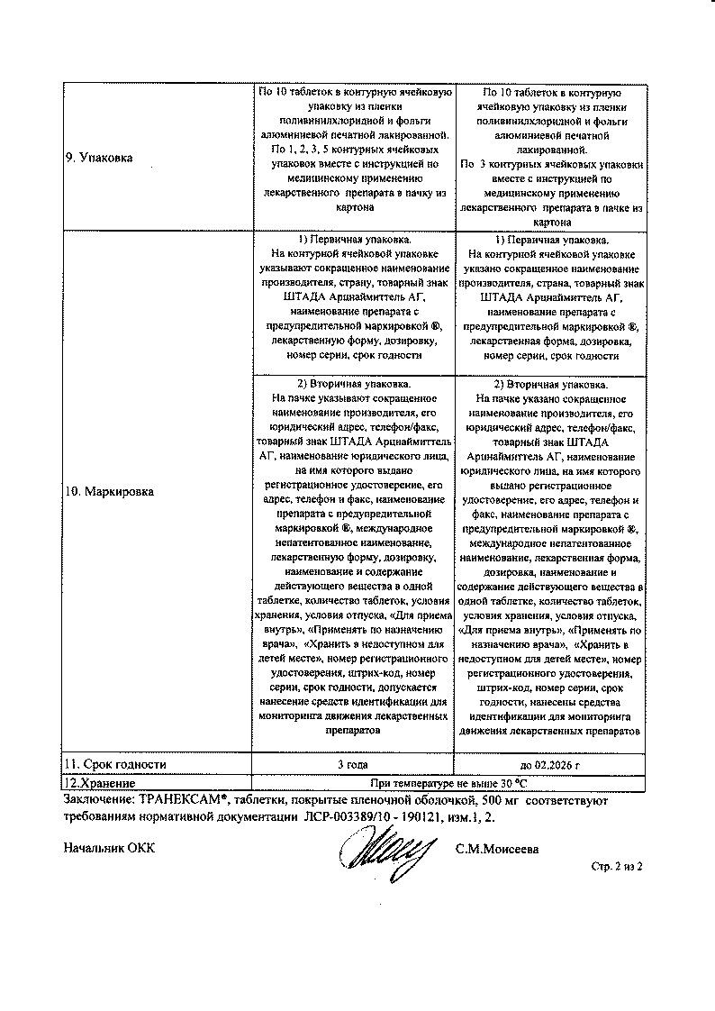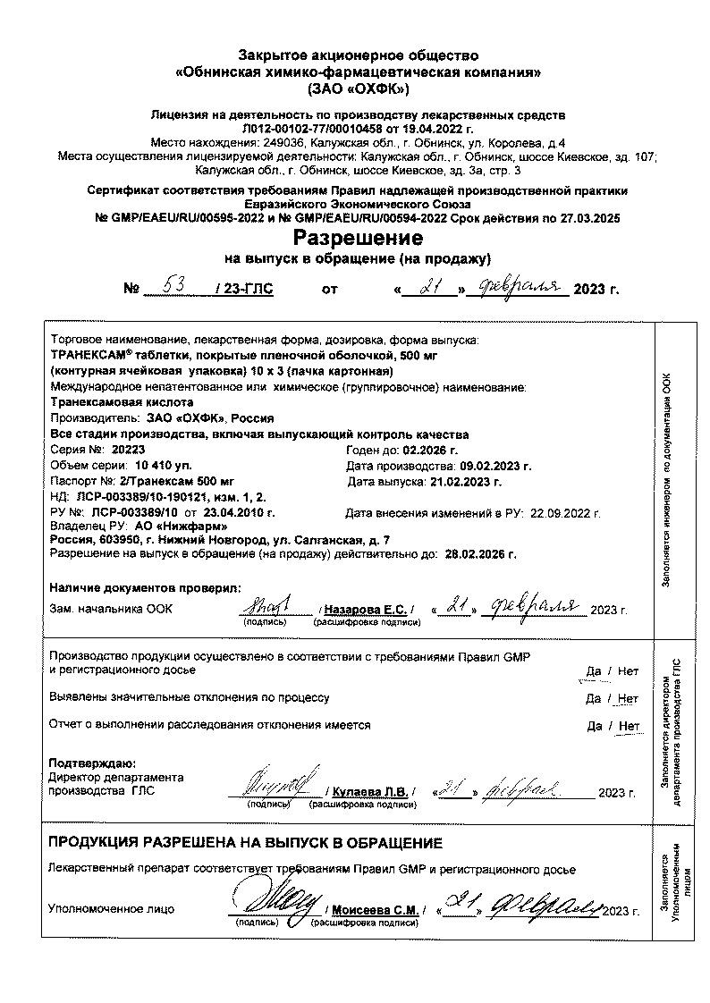 Транексам 500 мг 30 шт таблетки покрытые пленочной оболочкой