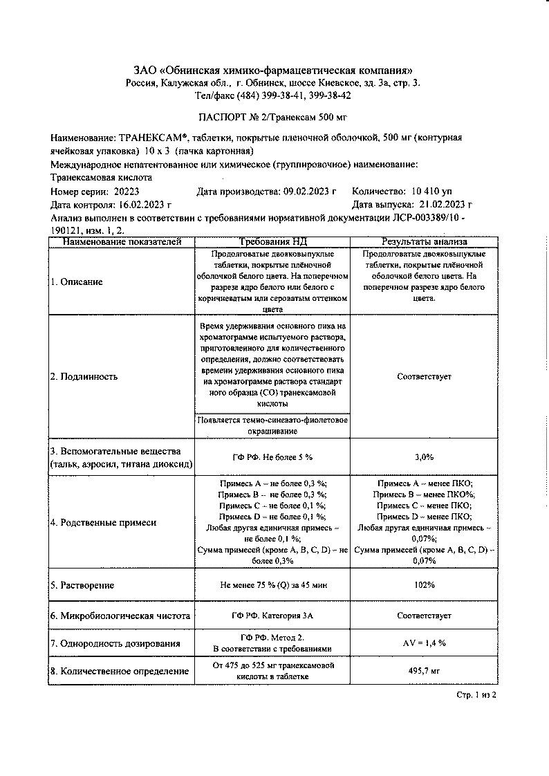 Транексам 500 мг 10 шт таблетки покрытые пленочной оболочкой