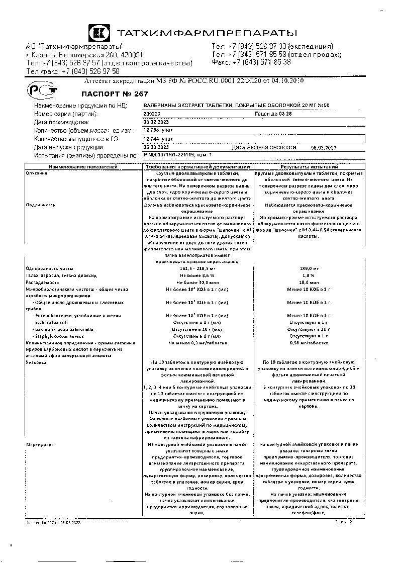 Валерианы Экстракт 20 мг 50 шт таблетки покрытые оболочкой