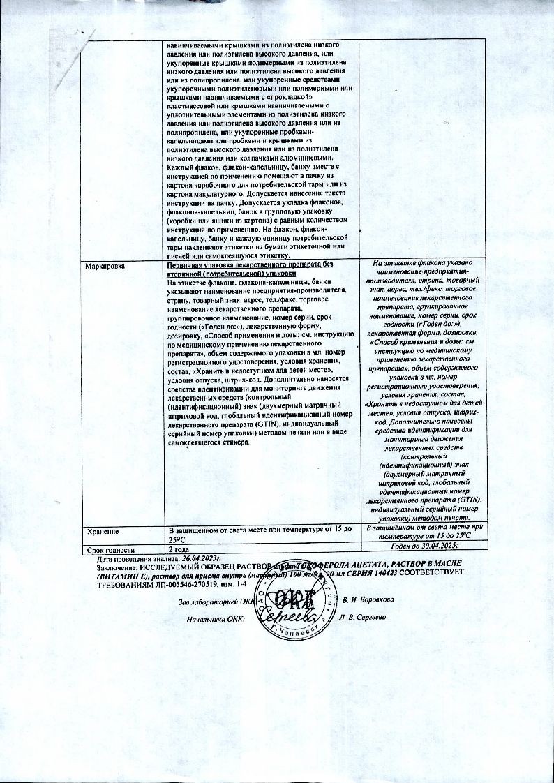 Витамин Е (Альфа-Токоферола Ацетат) 30 % 50 мл раствор для приема внутрь масляный