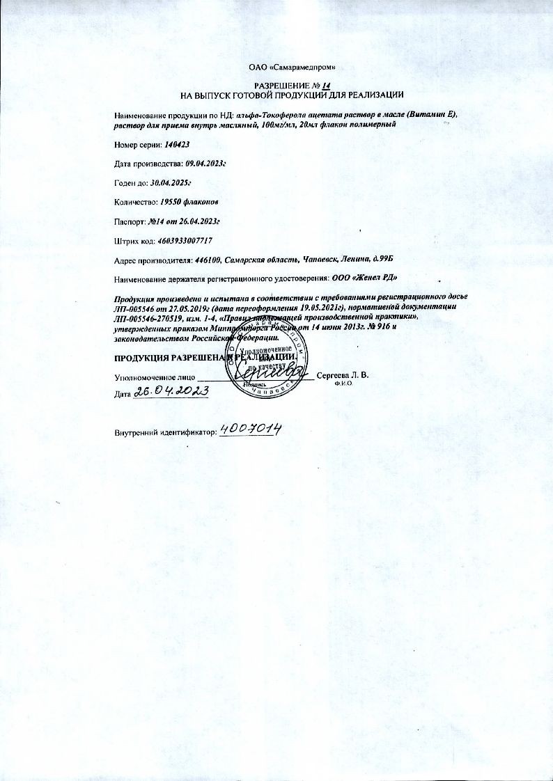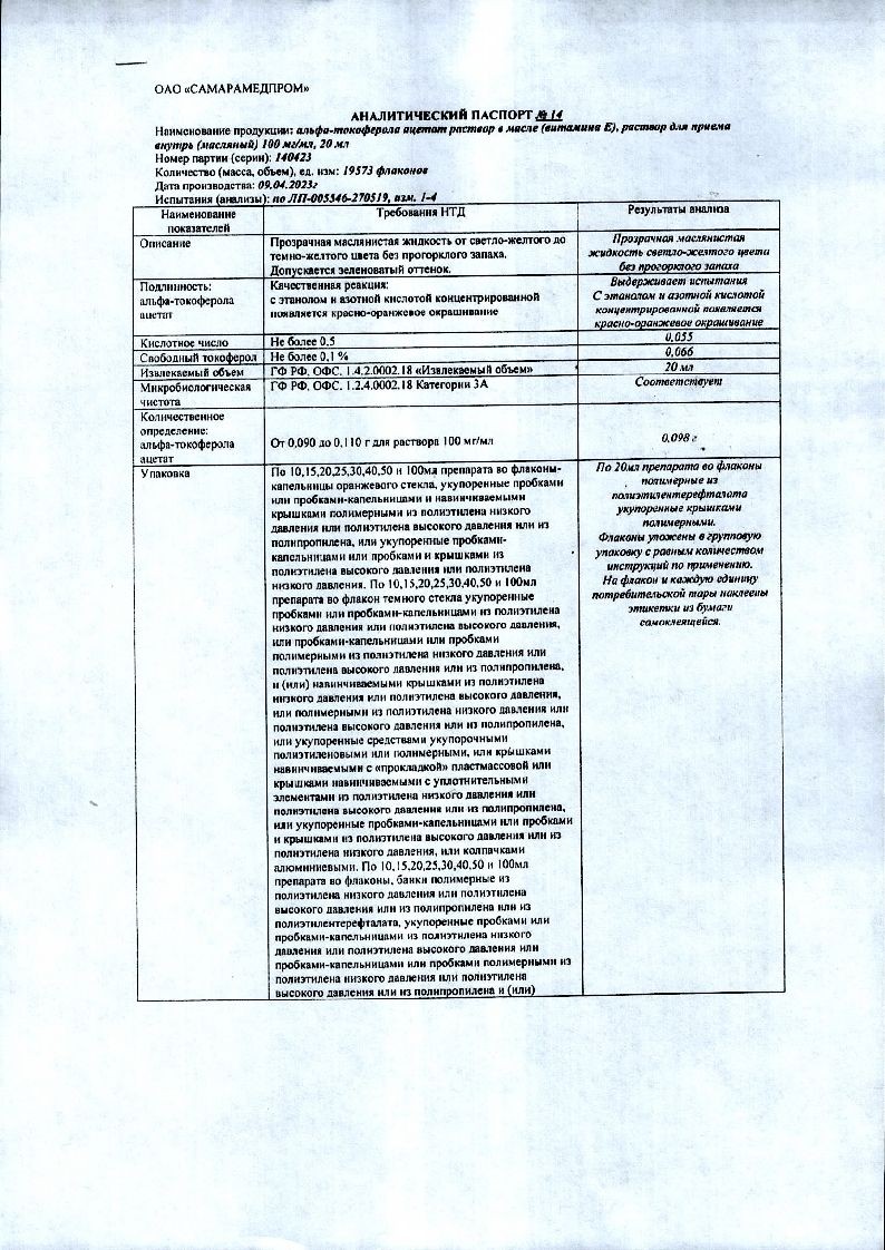 Витамин Е (Альфа-Токоферола Ацетат) 10 % 20 мл раствор для приема внутрь масляный