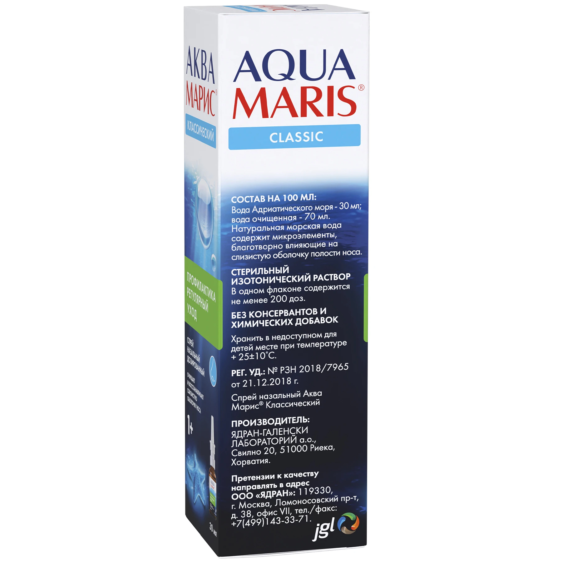 100 мл раствора содержат 30 мл воды Адриатического моря с натуральными микроэлементами и 70 мл воды очищенной.