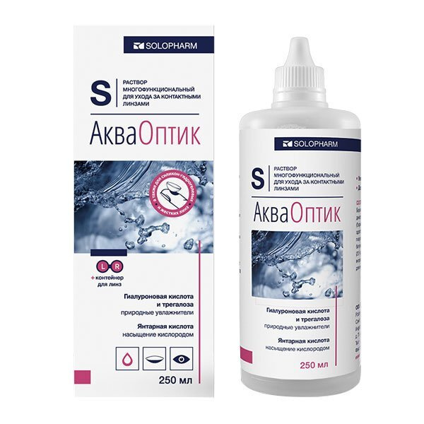 Благодаря специальному увлажняющему комплексу, содержащему природный компонент – натрия гиалуронат (гиалуроновая кислота), раствор АкваОптик обеспечивает мягкое скольжение линзы по поверхности роговицы, длительное оптимальное ув- лажнение и комфорт. Натрия гиалуронат является физиологическим полисахаридным соединением, содержащимся как в тканях глаза, так и в других тканях и жидкостях организма человека.