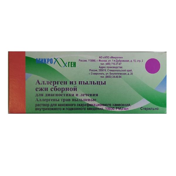 Аллерген из пыльцы ежи сборной для диагностики и лечения 10000 PNU/мл 5 мл 1 шт раствор для внутрикожного и подкожного введения накожного скарификационного нанесения и проведения прик-теста