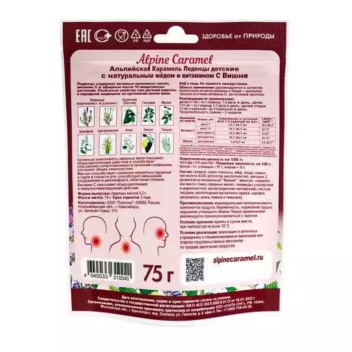 Кармолис леденцы снова в России! Новое название, тот же состав, прежнее высокое качество! Леденцы Alpine Caramel Альпийская Карамель содержат натуральный мёд и кармоловое масло (комплекс эфирных масел 10 лекарственных растений). Полезные свойства этих лекарственных растений известны на протяжении многих веков. Состав проверен временем и подбирался с учетом синергии компонентов, когда в комплексе они дополняют и усиливают действие друг друга. Активные компоненты кармолового масла способствуют повышению сопротивляемости организма к инфекциям, улучшают общее самочувствие. Комплекс эфирных масел обладает антисептическим, противомикробным, противовирусным, иммуномостимулирующим и мягким гармонизирующим действием на нервную систему. Компоненты эфирных масел лекарственных растений улучшают отхождение мокроты, стимулируют пищеварение, улучшают общее состояние организма. Рекомендованы детям от 3 лет и старше. Приятный вишневый натуральный ароматизатор смягчает вкус эфирных масел, и дети не сопротивляются принимать полезные леденцы. За счет постепенного высвобождения эфирных масел при рассасывании леденцов, проявляется пролонгированное действие и создается эффект ингалирования полости рта полезными компонентами трав. Могут использоваться для облегчения симптомов укачивания.