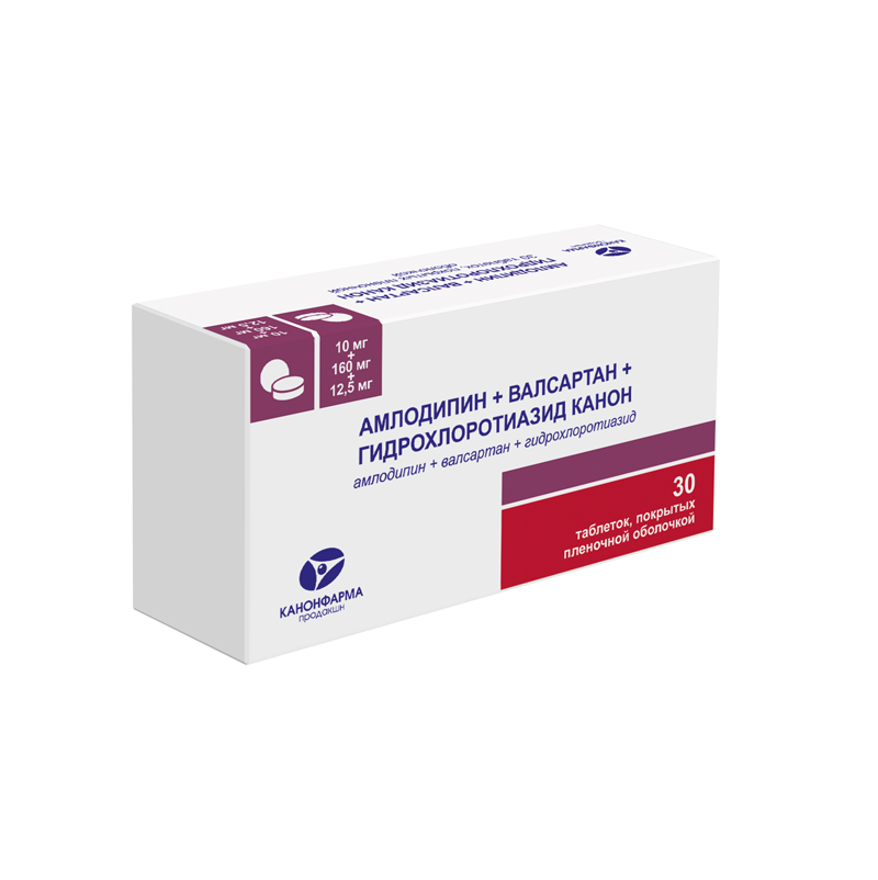 Амлодипин + Валсартан + Гидрохлоротиазид Канон 10 мг + 160 мг + 12,5 мг 30 шт таблетки покрытые пленочной оболочкой