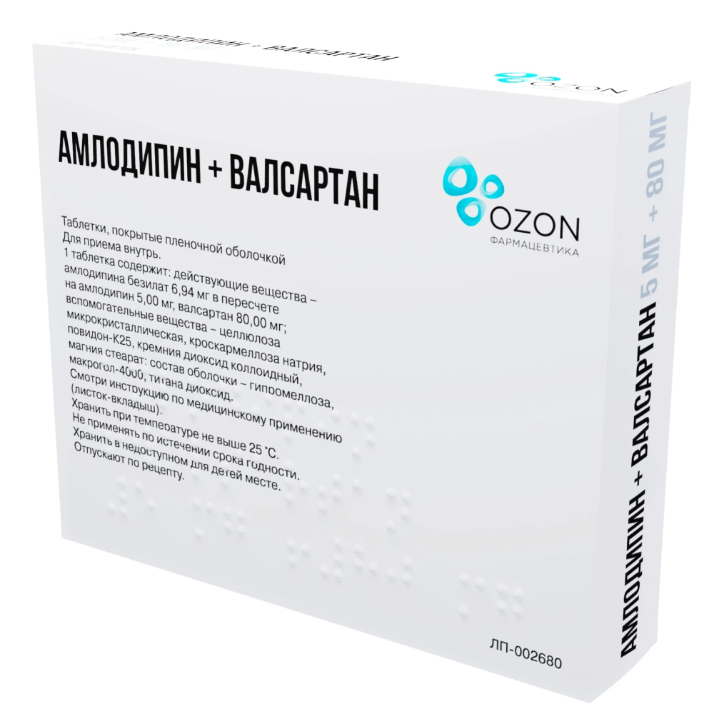 Действующие вещества: амлодипина безилат - 6,94 мг в пересчете на амлодипин - 5,0 мг, валсартан - 80,00 мг.