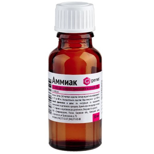 Аналептическое, антисептическое средство. При вдыхании вызывает раздражение слизистой оболочки дыхательных путей и рефлекторно возбуждает дыхательный и сосудодвигательный центры. Оказывает дезинфицирующее действие на кожу. В больших дозах раствор аммиака может вызвать рефлекторную остановку дыхания. При длительном контакте раздражающее действие на кожу может переходить в прижигающее (коагуляция белков) с развитием гиперемии, отечности и болезненности.
