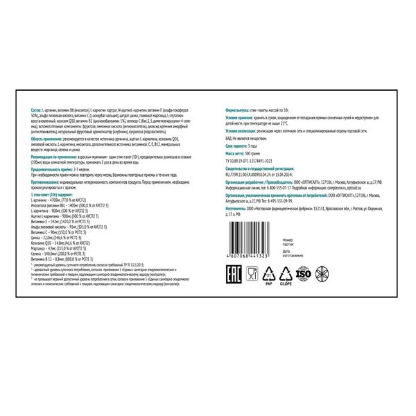 L-аргинин, витамин В8 (инозитол), L-карнитин тартрат, N-ацетил L-карнитин, витамин Е (альфа-токоферол 50%), альфа липоевая кислота, витамин С (L-аскорбат кальция), цитрат цинка, глюконат марганца, L-глутатион восстановленный, коэнзим Q10, витамин В 12 (цианокобалоамин 1%), селекор С (бис,1,3,-диметилпиразолил-4-селенид); вспомогательные компоненты: фруктоза, лимонная кислота (Е330 антиокислитель), диоксид кремния аморфный (Е551 антислеживатель), натуральный фруктовый ароматизатор (клубника), сукралоза (Е(995 подсластитель).