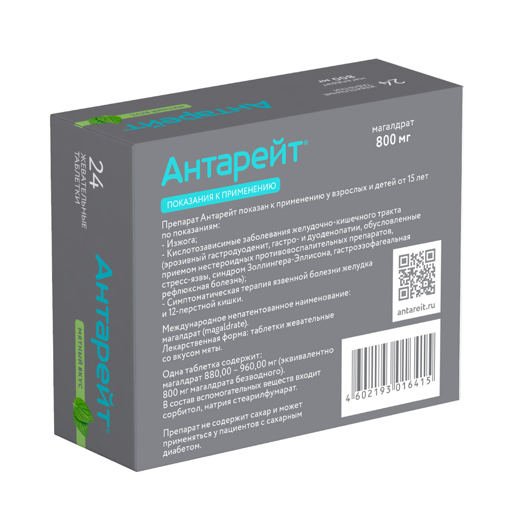 Препараты, которые нейтрализует кислотность желудка (антациды), к которым относится препарат Антарейт®, могут снижать всасывание других лекарственных средств при совместном применении. Поэтому, интервал между приемом препарата Антарейт® и других препаратов должен составлять не менее 2 часов.