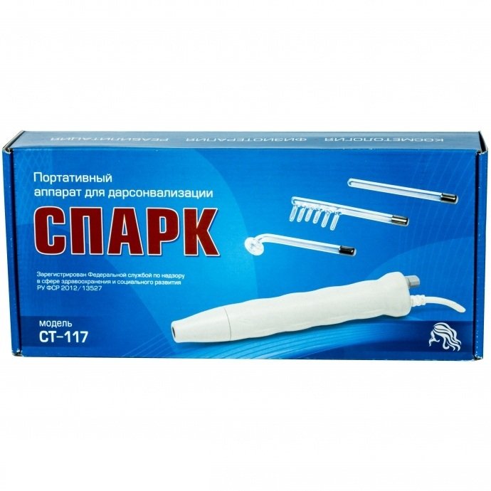 Спарк СТ-117 - профессиональный дарсонваль, предназначенный для проведения лечебных и косметических процедур в медицинских учреждениях, косметических салонах и домашних условиях; единственный прибор этого направления, утвержденный для реализации через систему фармдистрибуции РФ (регистрационное удостоверение Минздрава РФ № ФСР 2012/13527).