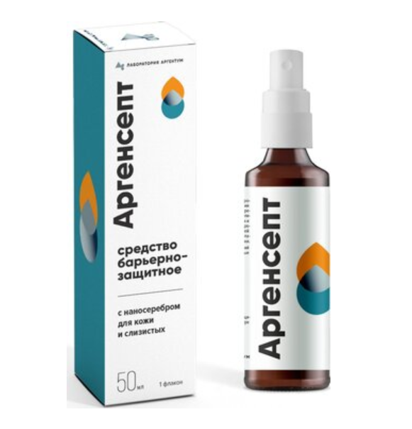 Медицинское изделие «Средство барьерно-защитное с наносеребром «АРГЕНСЕПТ» для кожи и слизистых по ТУ 32.50.50-004-13034791-2019» признанно Росздравнадзором МЗ РФ принципиально новым видом медицинского изделия, не имеющим аналогов в РФ и в мире. Эффект: Спрей «АРГЕНСЕПТ» обладает выраженным антисептическим действием, присущим серебру. Эффективен в отношении патогенной микрофлоры. Дополнительно, при применении спрея «АРГЕНСЕПТ» отмечаются противозудный и ранозаживляющий эффекты на коже и слизистых оболочках. НАЗНАЧЕНИЕ: Профилактика возникновения и развития воспалительных процессов на неповрежденных коже лица и тела, а также слизистых полости рта, носоглотки, глаз и уха, в том числе имеющих признаки раздражения и воспаления, после воздействия патогенной микрофлоры и вредных факторов окружающей среды путем формирования противомикробного барьера за счет создания на поверхности кожи и слизистых тончайшей микропленки с наночастицами серебра, обладающего антисептическим действием. ОБЛАСТИ РАЗРЕШЕННОГО ПРИМЕНЕНИЯ: Дерматология, стоматология, комбустиология (ожоги), гериатрия, педиатрия, хирургия, косметология, интимная гигиена и домашнее самостоятельное использование с целью антисептического воздействия, устранения раздражений и воспалений на коже и слизистых. Для профилактики конъюнктивитов, воспалений век, при попадании инородных тел в глаза, при раздражении в носоглотке и полости рта.