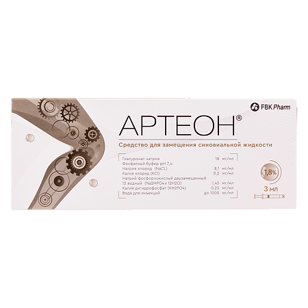 Гиалуроновая кислота, входящая в состав Средства АРТЕОН® (ARTEON®), имеет молекулярную массу 2,2 млн дальтон, близкую к естественной гиалуроновой кислоте человека, и оказывает положительный эффект после введения при диагнозе «остеоартроз» («остеоартрит»).