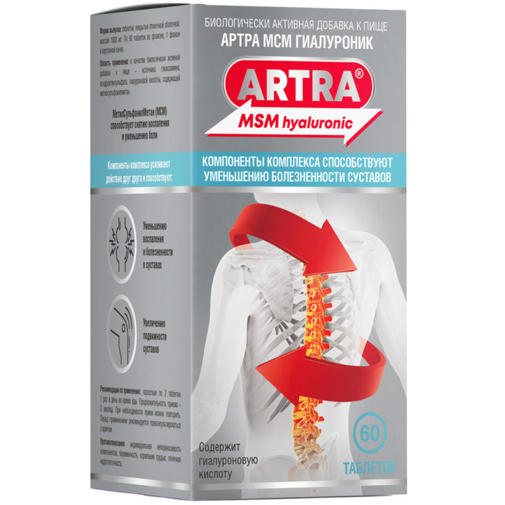Состав: D-глюкозамина гидрохлорид, хондроитина сульфат, агент антислеживающий целлюлоза микрокристаллическая, метилсульфонилметан, оболочка таблетки (стабилизатор гидроксипропилметилцеллюлоза, агент антислеживающий тальк, cтабилизатор гидроксипропилцеллюлоза, концентраты сафлора и лимона, пеногаситель стеариновая кислота, стабилизатор полиэтиленгликоль, краситель кармины, краситель оксид железа желтый), стабилизатор карбоксиметилцеллюлоза натриевая соль кроссвязанная, агент антислеживающий магниевая соль стеариновой кислоты, гиалуронат натрия, агент антислеживающий диоксид кремния аморфный.