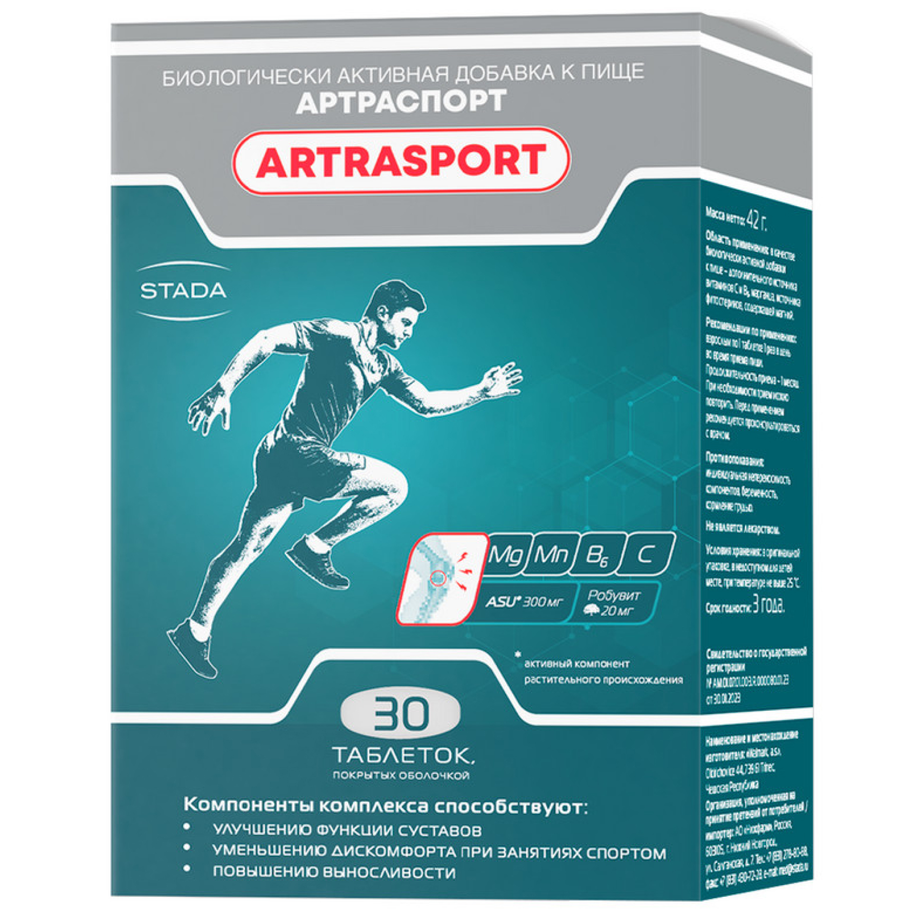 Неомыляемые фракции масел авокадо и соевых бобов, антислеживающий агент целлюлоза микрокристаллическая, носитель орто-фосфат кальция 2-замещенный, магний (магния оксид), оболочка таблетки (стабилизатор гидроксипропилметилцеллюлоза, рисовый крахмал, стабилизатор полиэтиленгликоль, антислеживающий агент тальк, эмульгатор эфиры сахарозы и жирных кислот, краситель оксид железа желтый, черный, красный), стабилизатор крахмал, обработанный щелочью, стабилизатор карбоксиметилцеллюлоза натриевая соль кроссвязанная, антислеживающий агент диоксид кремния аморфный, антислеживающий агент магниевая соль стеариновой кислоты, витамин С (L-аскорбиновая кислота), экстракт древесины дуба черешчатого (Quercus robur), марганец (марганца глюконат), витамин В6 (пиридоксина гидрохлорид).