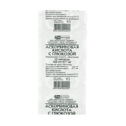 действующие вещества: аскорбиновая кислота 100 мг, глюкоза - 877 мг,