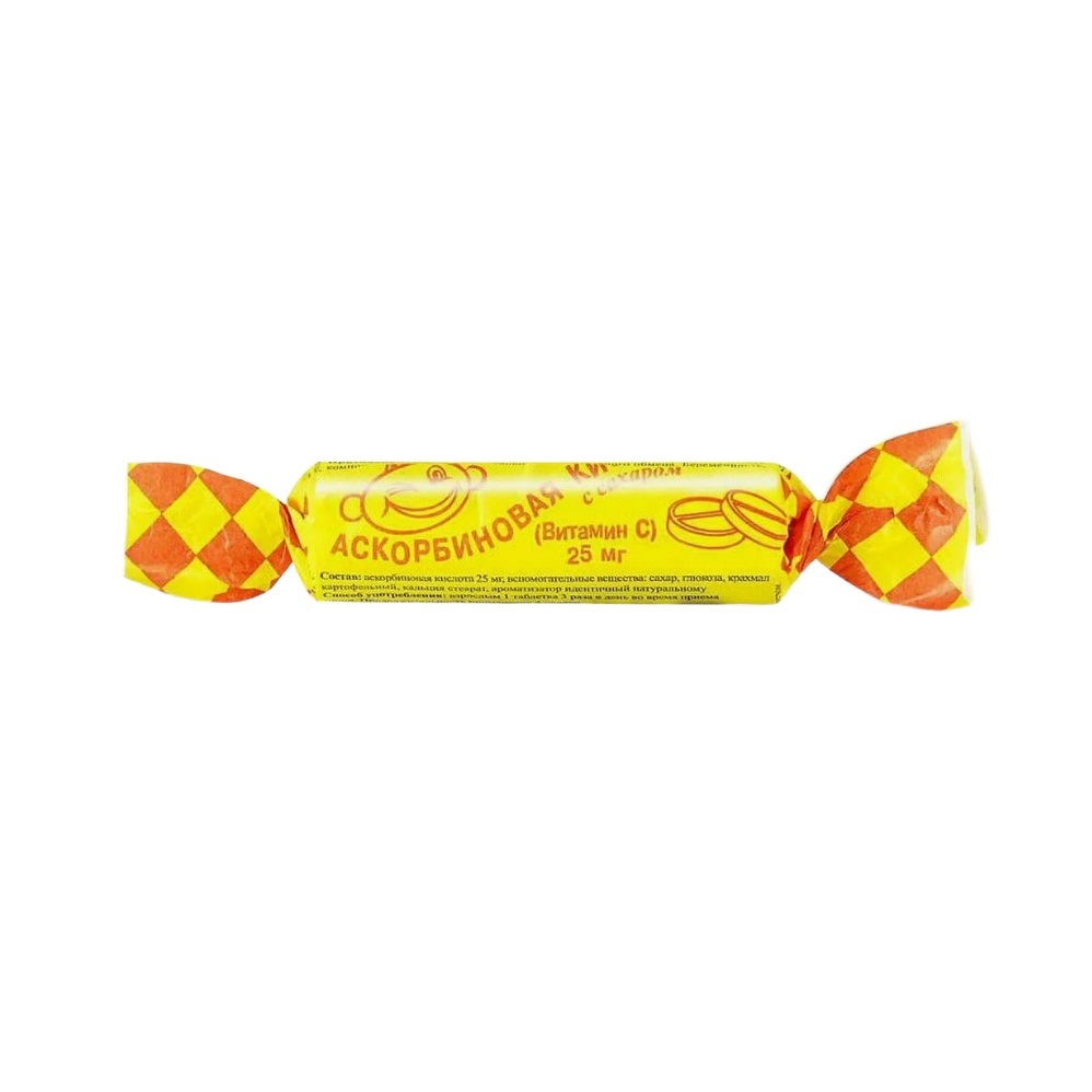 Аскорбиновая кислота, сахар, глюкоза, картофельный крахмал, стеарат кальция, ароматизаторы натуральные или идентичные натуральным.