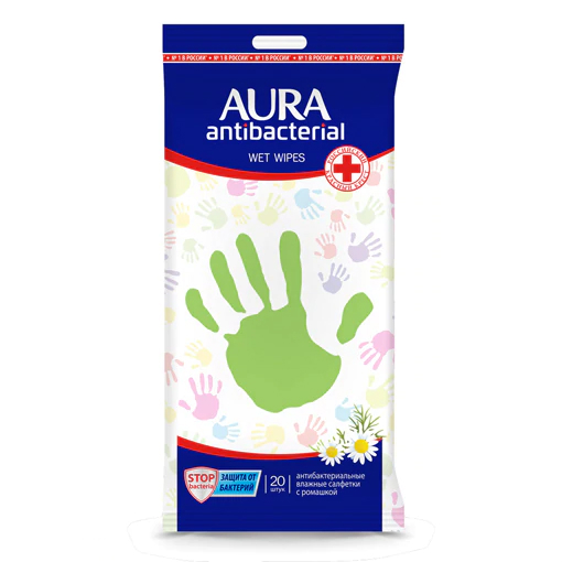 AURA Влажные салфетки антибактериальные имеют поддержку Российского Красного Креста. Яркая  упаковка имеет отверстие для подвешивания.
