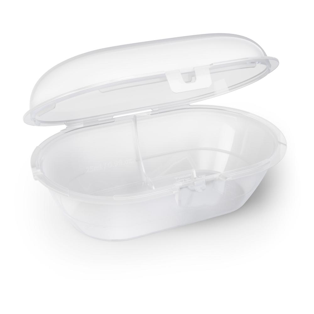 Положите в футляр хорошо промытые пустышки, добавьте 0,25 мл воды и поставьте его в микроволновую печь на 3 минуты при мощности 750–1000 Вт. Охладите в течение 5 минут, вылейте из футляра воду — и процесс завершен!