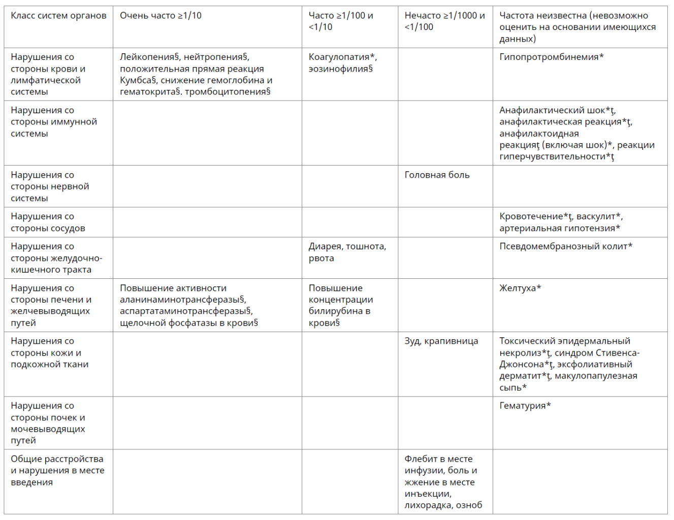 Симптомы: при передозировке можно ожидать появления нежелательных эффектов, зарегистрированных при использовании препарата. Высокая концентрация бета-лактамных антибиотиков в спинномозговой жидкости может привести к неврологическим нарушениям, включая судороги.