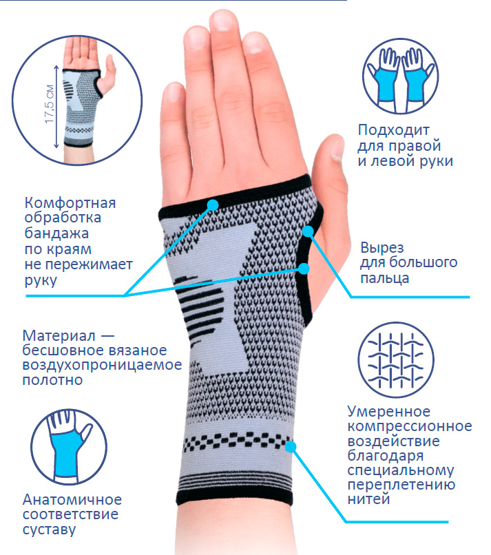 • Бандаж плотно облегает лучезапястный сустав и не смещается при движении