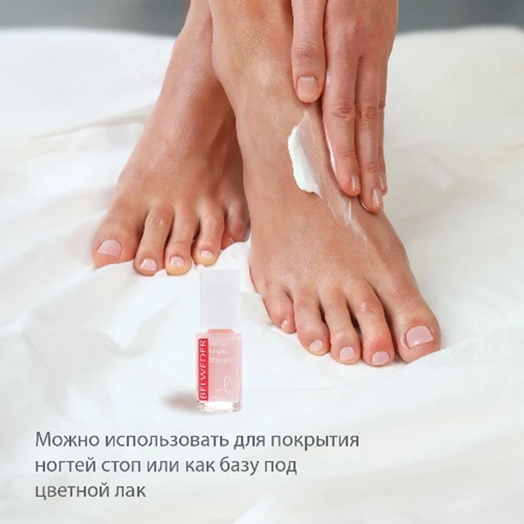 На чистые сухие ногти нанесите 1- 2 слоя лака. Дайте полностью высохнуть. Можно использовать самостоятельно или как базу.